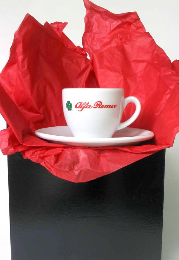 Zde.: bílý hrníček - jeden s černým a druhý s červeným vnitřkem - oba s logem Alfa Romeo