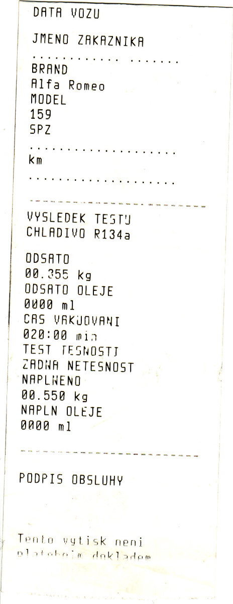 Z tý mašiny vyjede "paragon" s údaji o tom, co z toho vypustili a kolik doplnili. Doplněno by mělo být 550g chladiva.