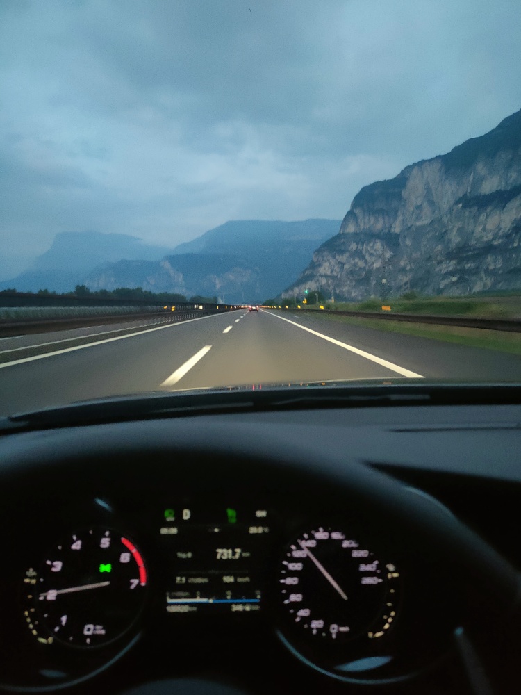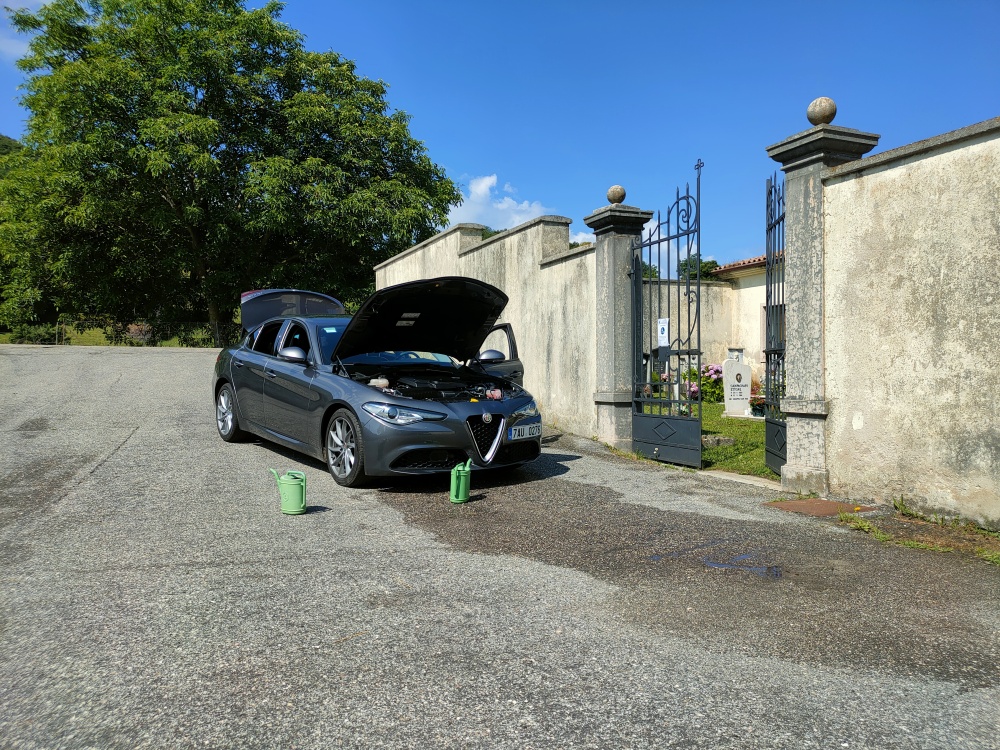 No jel jsem se svézt po místních passech* od Affi na Pradu a asi po kilometru, pravda dost ostrém, cítím chladičku... v zrcátku za mnou nebylo vidět, kontrolka přehřátí, olej o čárku výš... hned jsem zvolnil a doplazil se kousek někam, abych se dal alespoň objet. První myšlenka byla prasklej chladič (co je teď u Giulií oblíbená disciplína), ale "naštěstí" se po otevření kapoty ukázala "jen" vypadlá hadice z chladiče. Jsou tam na obou takový ty rychlospojky.... Těžko říct proč se to stalo, každopádně jsem ji zacvakl zpět, opatrně se dobelhal pár set metrů k místnímu cimiteru, kde měli kohoutek s vodou. Dolil jsem to, dost blbě se to odvzdušňovalo, ale nakonec se podařilo a ta svěcená voda je tam vlastně doteďZítra jedu na výměnu