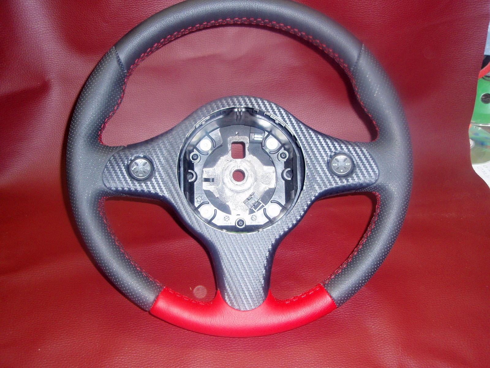 A tak vzhledem k předchozím úpravám tapecu a sedačky k tomu sedí i ten spodek volantu v červené kůži - to už bych v danou chvíli neřešil. Všechno je to otázka osobního vkusu a pokud se ti líbí výrazná rudá v interiéru v kombinaci s karbonem, tak není problém a nenech se odradit. Já bych spíš upozornil na opravdu špičkovou práci při obšití volantu, to jsem fakt nečekal. Až to své kormidlo trochu ohmatám, tak bych do toho šel taky - samo bez té červené, ale kombinace perforovaná a hladká kůže, obšití a přechody, to je fakt luxus.