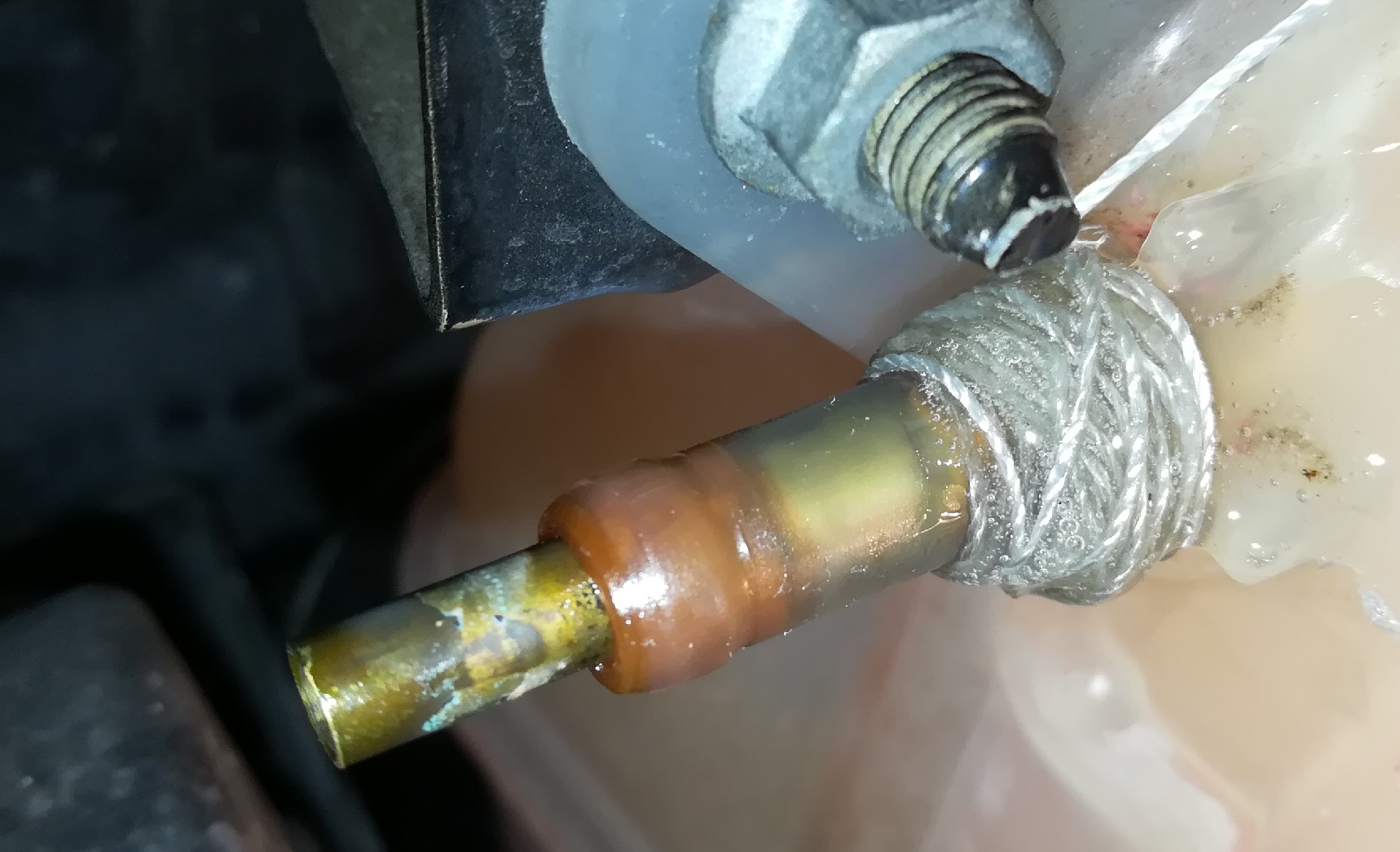 Epoxid vyztužený špagátem vydrží hodně, ale ty praskliny jsou tam dvě. Jedna zespoda hned u nádržky a druhá zhora a kus dál. Mám pochyby, zda to zachvíli neupadne celé, protože se nebylo moc čeho chytit. Nevím jak moc v tom drží ta mosazná trubička, zda má uvnitř dost velký rantlík.