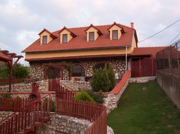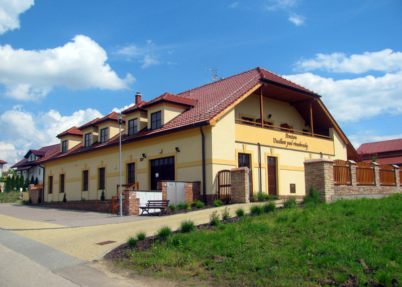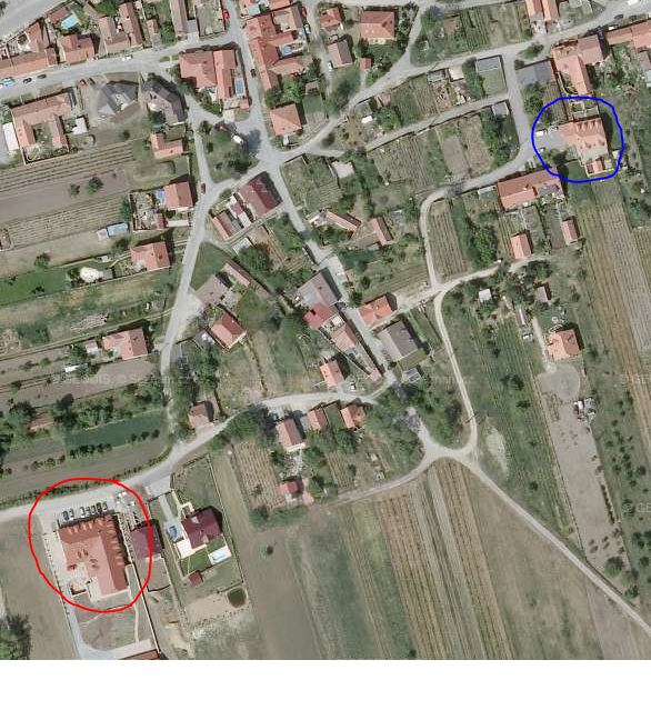 Na spaní to budeme mít cca 500 metrů chůze. Pro lepší představu přikládám obrázek. V červené bublině je penzion, v modré je sklípek.