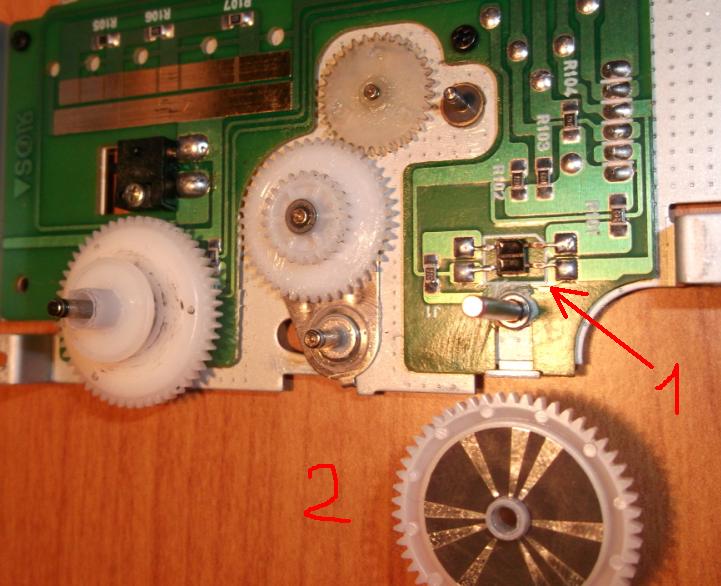 No sundání řemínků též nepomáhá jak píše Petan a může za to foto senzor či jaké si pohybové čidlo (1) které čte fólii na dně ozubeného kolečka (2) které pohání pásku. Bohužel nejsem elektrikář a nevím jak to čidlo ojebat.