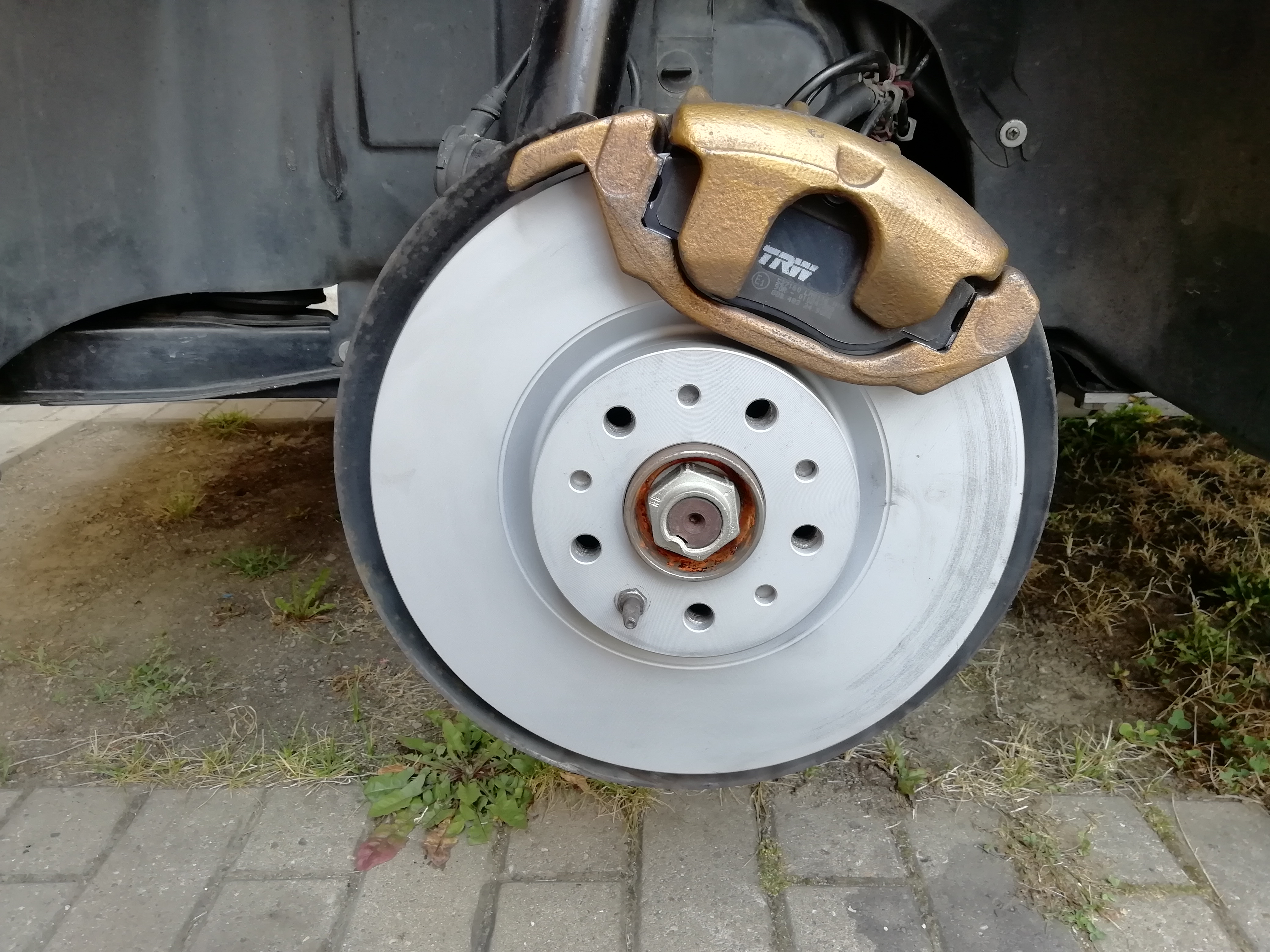 Někde v mezičase jsem už zlomil hůl nad původními brzdami. Kotouče byly neznámé a ještě od koupi auta, desky Ate už pomalu končily. Po nějakých laboracích* jsem vzal železo od herr Zimmermann a desky od TRW (což se později ukázalo jako ne úplně dobrá volba).