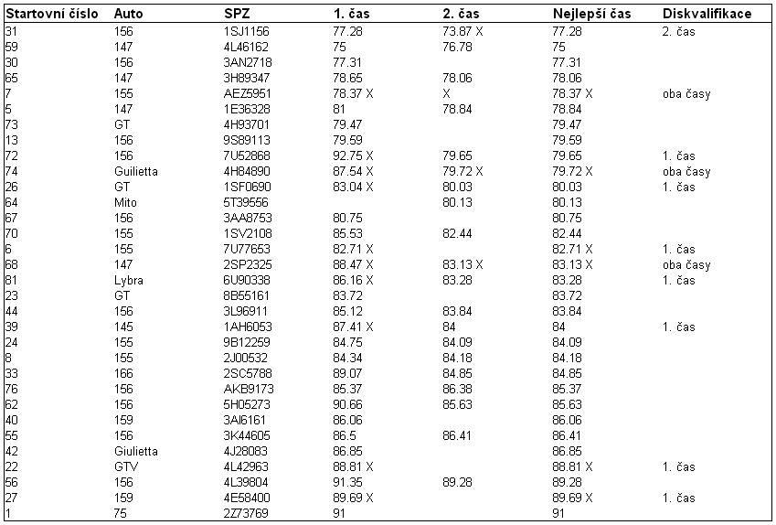 Některé časy jsou přeházené oba mezi čísly, jiné pouze jedna jízda, někde časy chybí a občas je to v pořádku. Nechápu, jak se jim to mohlo stát. Vždyť byly dvě tratě, u každé si na papír zapsal změřený čas a k tomu číslo. To samé u okruhů. Stačilo to pouze přepsat do Pc. Teď to nějak louskají z toho papíru. Příště asi jinou firmu, no.