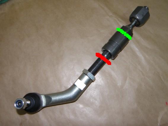 Rozpadlo se to přesně v místě kde je označeno zeleně a čep mám natočen až do polohhy kam ukazuje červená ryska,takže podle mě prostě někdo točil,točil až vytočil.Takže to dorvu natvrdo a cca o stejný kus posunu čep aby to jelo rovně a pak na geometrii.Pro jistotu tento spoj zalepím pojištěním na šrouby