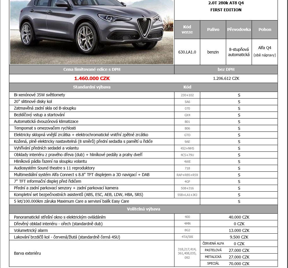 tady aspoň 1st edition z 1/2017... víc nemám.... obecně mi přijde že Stelvio je zajímavé v těch slabších 4x4 verzích bez nějaké extra výbavy, tam to bývalo kolem 1-1,2 mio s daní.... jakmile si začneš vymýšlet a chceš ty silnější verze, je to rázem +300 :-)Harous píše: 16.4.2021, pát 19:12 Ceny aut jdou dost nahoru obecně, ale nepodražilo Stelvio nějak moc? V konfiguraci s 280k benzínem začínám v podstatě na 1,6m a to tam nemám nic moc navíc.