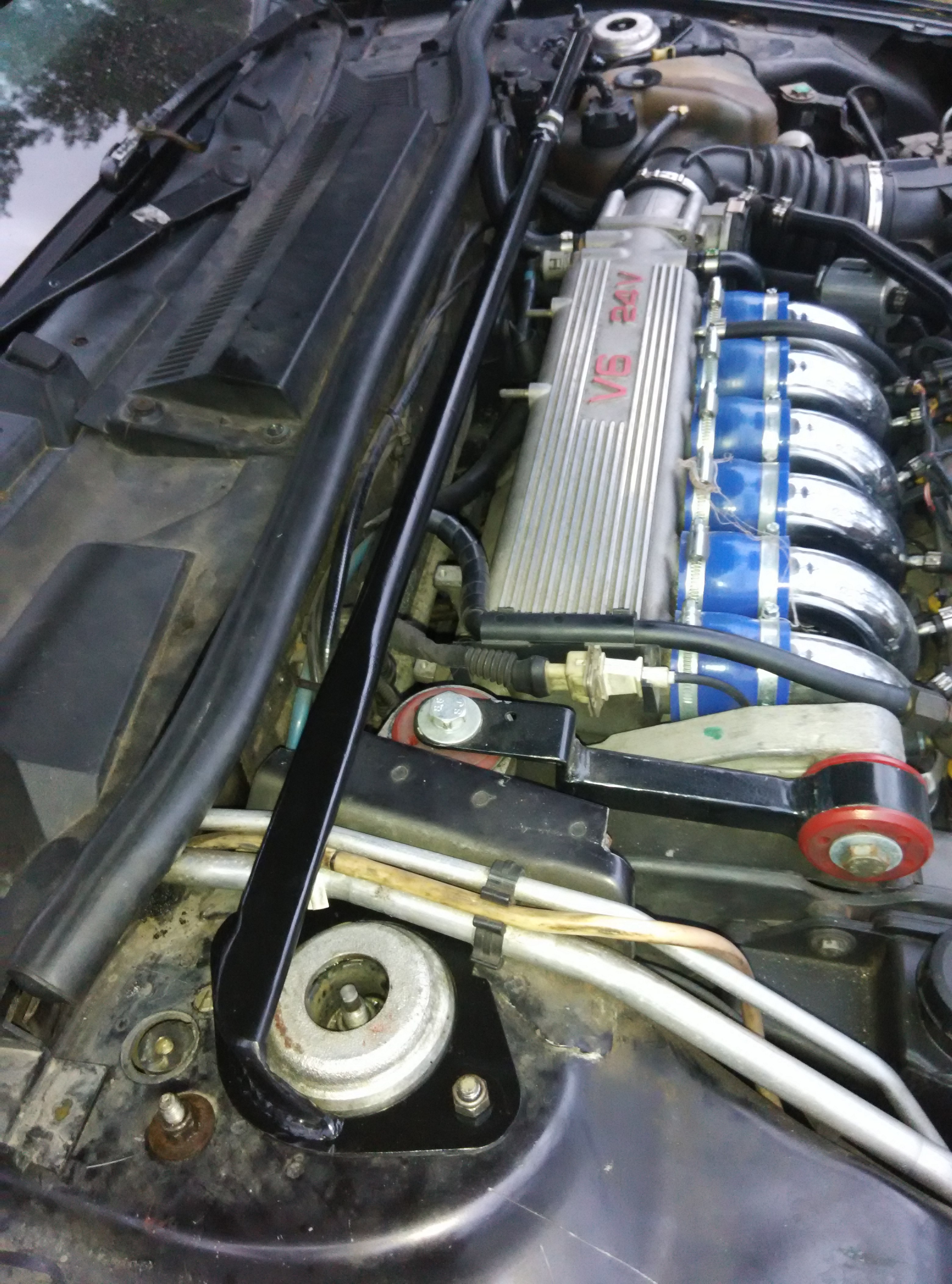 Přední odklony se dají částečně udělat propilování otvorů horního uložení tlumičů -lavory. Nedá se to moc, ale pomůže to. Tímto způsobem jsem se sice nedostal na předepsané hodnoty, ale srovnal jsem si levou a pravou stranu. Udělal jsem si rozpěru, ale zatím jsem ji tam natrvalo nedal kvůli STK - snad se to zase nerozjede.
