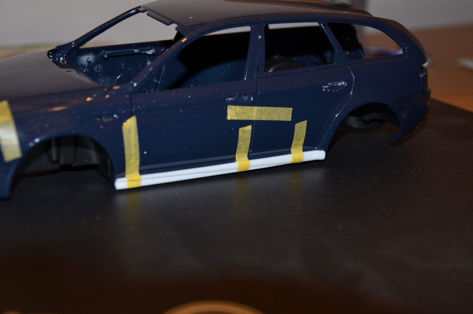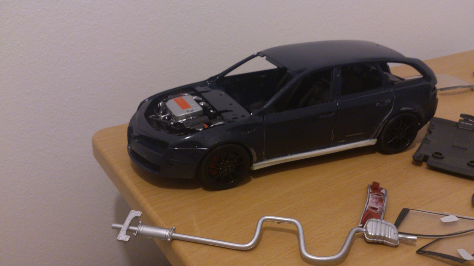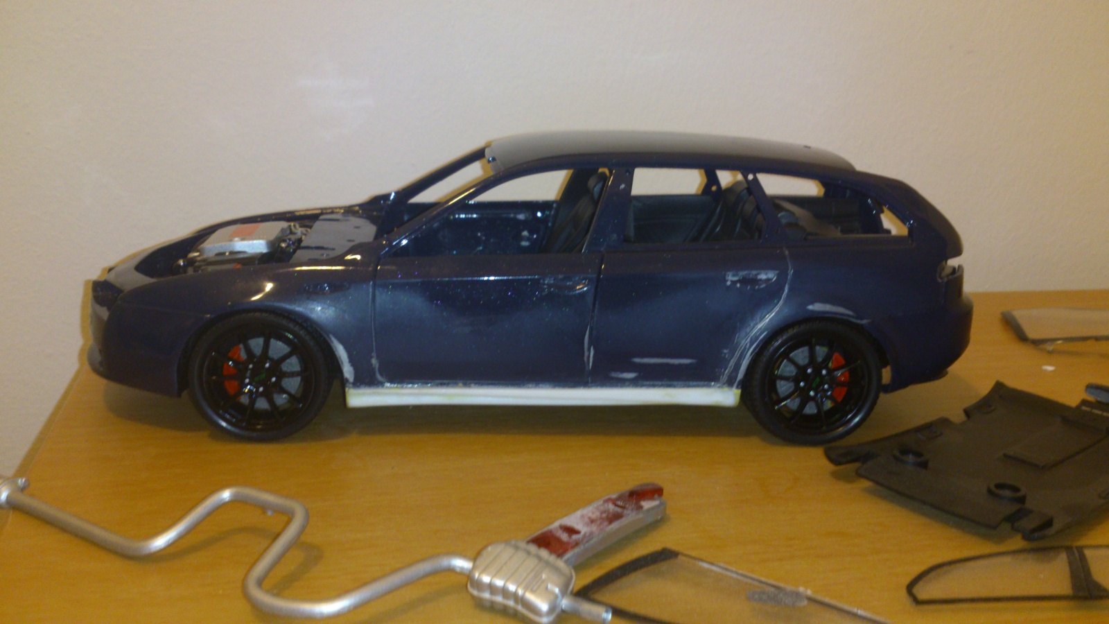 Tak práce na malé Alíně zase trošku poposkočili...byla snížena, dostala nová kola 19" jako ta skutečná dodělány spodní TI prahy, přilepeny a vytmeleny, zahajeno barevné vylepšování motoru a interiéru...