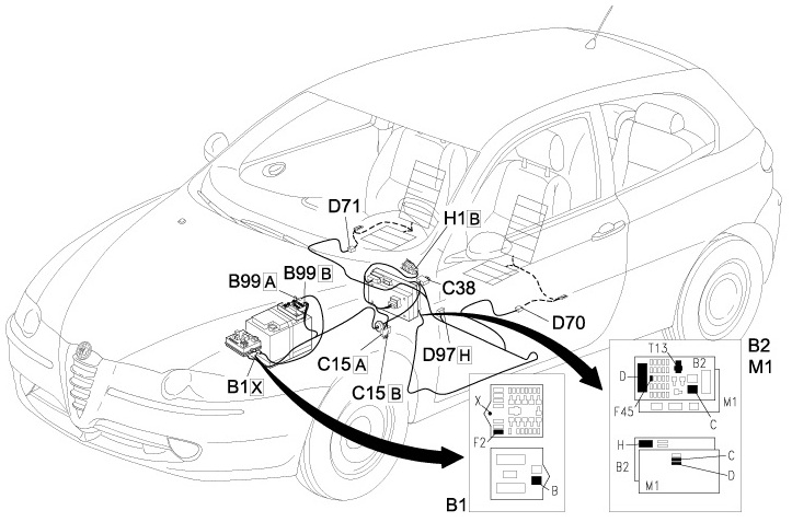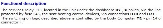 Většinou stačí dotáhnout kabel od B2-4D k sedačkám. D97H je propojka na podlaze (aby jsi netahal 2 kabely od bodycompu) pod sedačkou řidiče a C38 je zem u páky ruční brzdy. Svorkovnice na výhřev mají ale pouze 2 piny!!