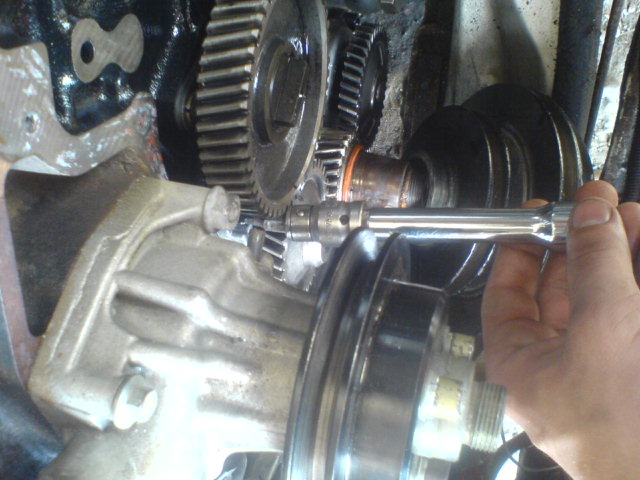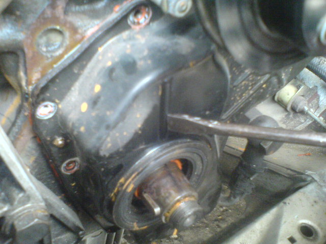 3/sundáte prsa, vytočíte 3 šrouby na vývěvě(nevím to tam má ford, když vývěvu má na alternástoru) pozor jeden šroub jde jedině násilím, vadí mu ozubené kolo-viz foto ŠROUB vývěvu pomalu vyndaváte ven a pomáháte si šroubovákem, protože opět jde velmi z tuha, kde opět vadí ozubené kolo viz foto páčit: vyndavejte vývěvu pomalu a opatrně, protože vám vypadají lamely viz foto vývěva: natočím vývěvu tak aby šla na značky jak na klice, tak i na vačce viz foto zuby: pozn.alfa 75 měla na vývěvě keště předpětové kolečko, které vymezovalo vůli mezi zuby, osobně si myslím, že to není špatnej nápad, ale už jsme to jednou viděl zničené a na tomto 2,8TD z roku 1992 již tento mechanismus není