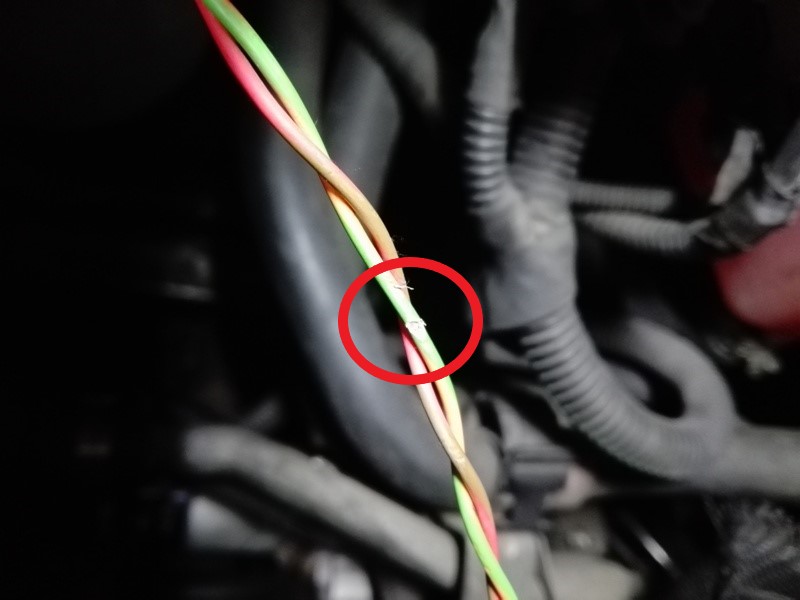Předminulou sobotu jsem rozdělal a vyčistil DRV ventil, vyměnil jsem O-kroužky a odzkoušel funkčnost. Týden jsem jezdil bez chyby, ale tento týden se chcípání zase opakovalo, tak jsem oslovil Čendlera a ten hned ukázal na kabelový svazek, co jde odspodu na zadní straně motoru přes vrch až ke vstřikovačům. Tak jsem auto natočil, zahýbal svazkem a ono to "krásně" chcíplo. Potom když jsem se svazkem hýbal, tak bylo slyšet, jak cvaká DRV ventil. Svazek jsem tedy rozbalil kam až to šlo a na vodiči k DRV ventilu jsem našel prodrbanou izolaci - viz foto.