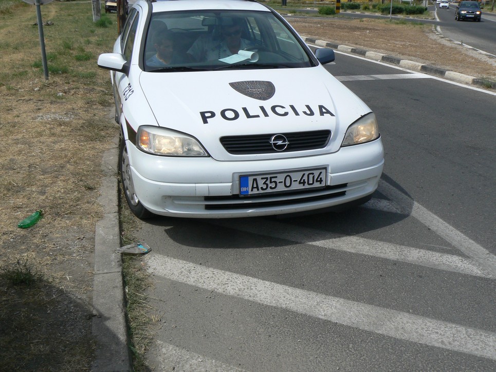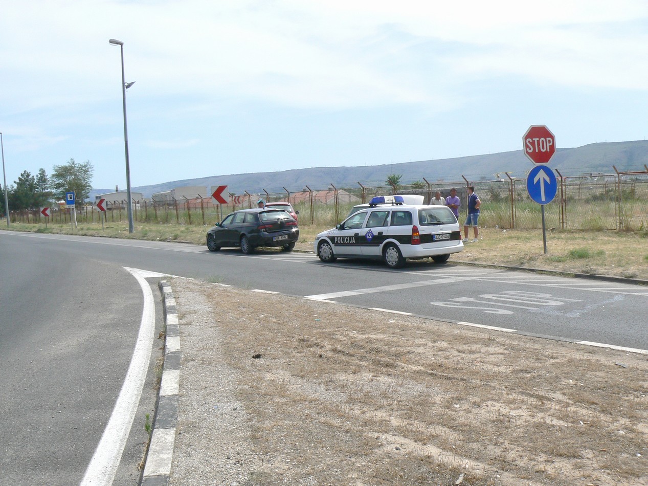 Odpoledne, při návratu na naší základnu na Pelješaci, jsme vyjížděli z Mostaru z vnitřní komunikace na mezinárodní E73. Na nájezdu je tam značka STOP, čára na silnici a nápis STOP. Rovina široko daleko, přehledné a jasné. Jedu dodržujíc předepsanou rychlost v obci, všichni víme, jak si na cizincích policie ráda smlsne, vyhodím kvalt , dojíždím, koukám vlevo jaký je na E 73 provoz, zastavuji, rovina a tak sundám nohu z brzdy a čekám až budu moci najet na hlavní. No, netrvalo to ani 15 vteřin, rána zezadu, Ája poskočila o 4 metry dopředu, dám ručku a letím z auta ven. Za mnou dva 18 letí Bosnáci v motykách 1.9 TDi čumí jak telata, co se stalo, rádio na plný kule. Tak jsem řidiče začal tahat ven, žíly na krku vzteky jsme měl jako provazy.