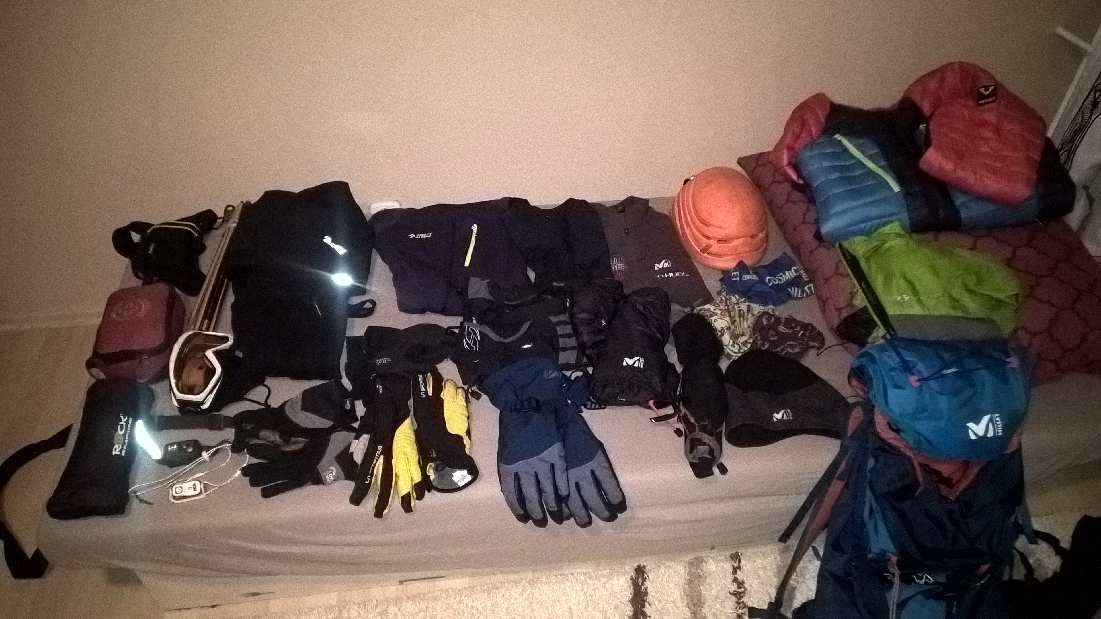 V podstatě kompletní sestava oblečení a vybaveni na tuto sezonu. Chybí jen lyže+vázko+pásy, lyžáky, hole, lavinová lopata (v zimě ji vozím v autě) a tenší izolační bunda z dutých vlakem. Ano, jsem ujetý na rukavice a nosím většinou všech 6 párů sebou. Ano, nikde tam není membránové oblečení, protože na zimu není membrána potřebná.