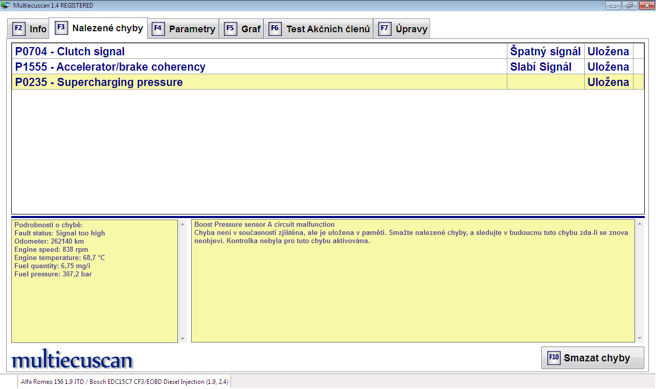 Tak problém s Motor Control System Failure vyřešen. Po smazání chyb nahoře auto najelo asi 1500Km bez problému až nakonec se chyba opakovala, zajel jsem do servisu Autoscan.cz, kde mi diagnostikovali špatný Overboost ventil. Ten byl následně vyměněn za jiný (ze 159 - stejný typ), který ale vyhodil tu stejnou chybu asi po 250Km. Chyba byla vymazána a auto ujelo dalších 1500Km bez chyby. Poté byl vyčištěn EGR ventil a při tom zjištěny propálené podtlakové hadičky pod EGR. Ventil jsem vyčistil a hadičky vyměnil za nové Festo. Po chybě ani stopa a turbodmychadlo si zase hvízdá. Při měnění termostatu se musel demontovat EGR, tak jsem ho zkontroloval a byl opět od sazí, tak jsem se rozhodl pro zaslepení. Teď si auto zakouří po nastartování a několika prvních metrech a pak už je to v pohodě. Rozdíl ve výkonu nula, v ohřátí motoru asi plus 2-3km.