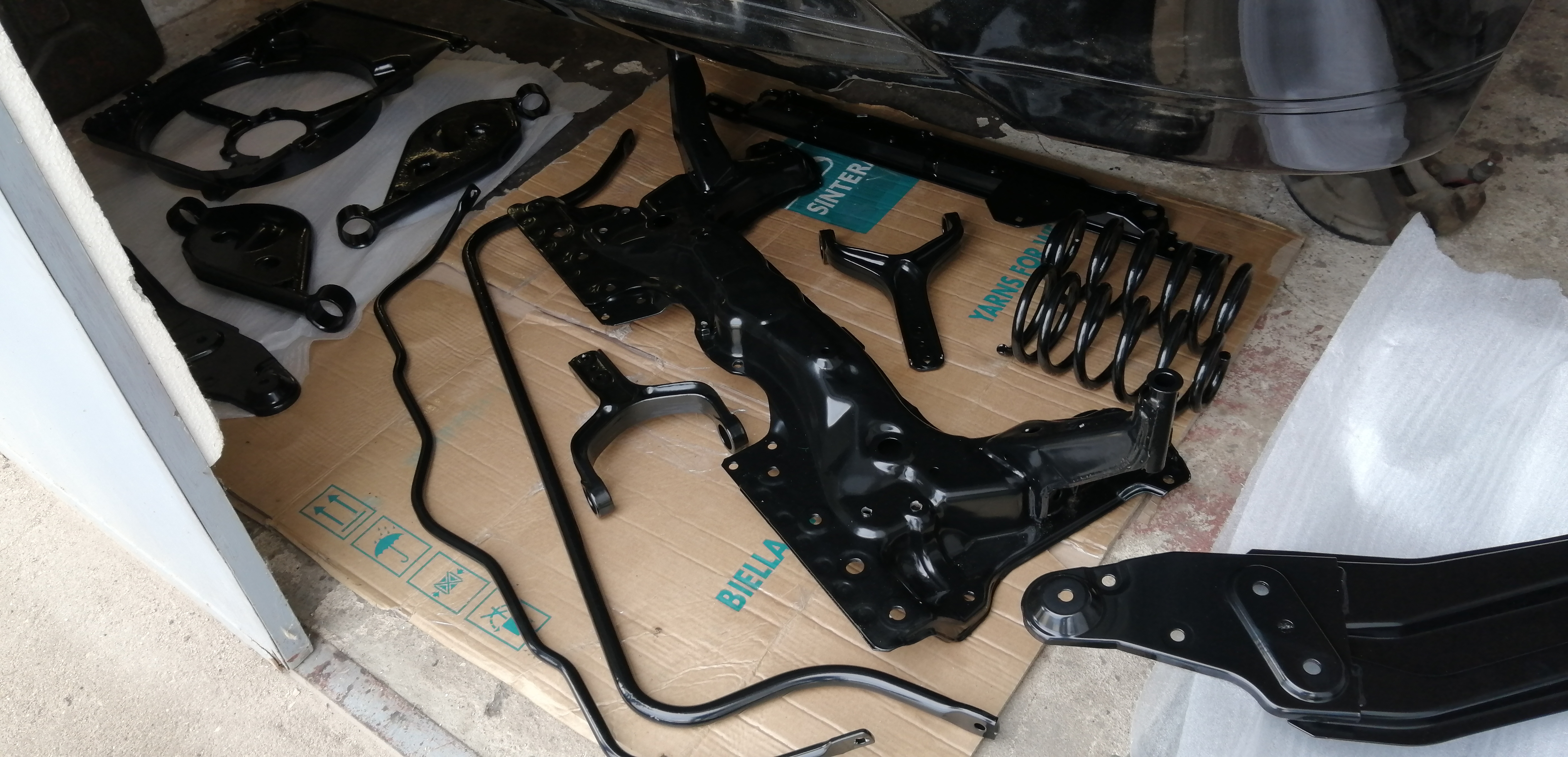 Po roce co sem auto měl, jsem ho akorát převezl do jiné garáže a začal rozebírat. Sundal jsem z auta vše co šlo a jelikož auto bylo ze spodu trošku orezly, řekl sem si, že když už to dělat pořádně tak všechno. Shodil sem teda obě nápravy, pak motor a komplet to celý odstrojil. Zůstal mi jen interiér (ten je teď teda taky rozebraný)