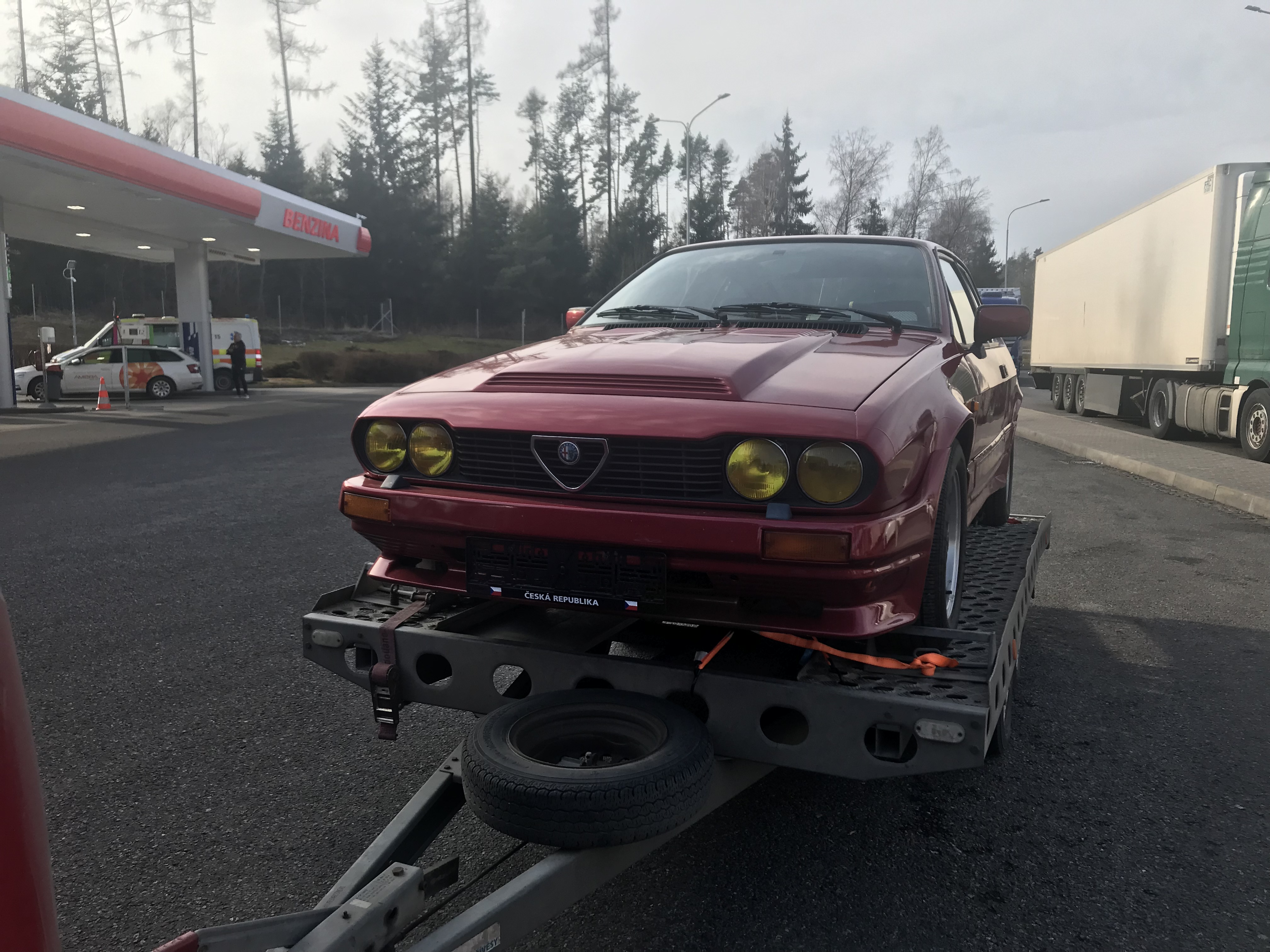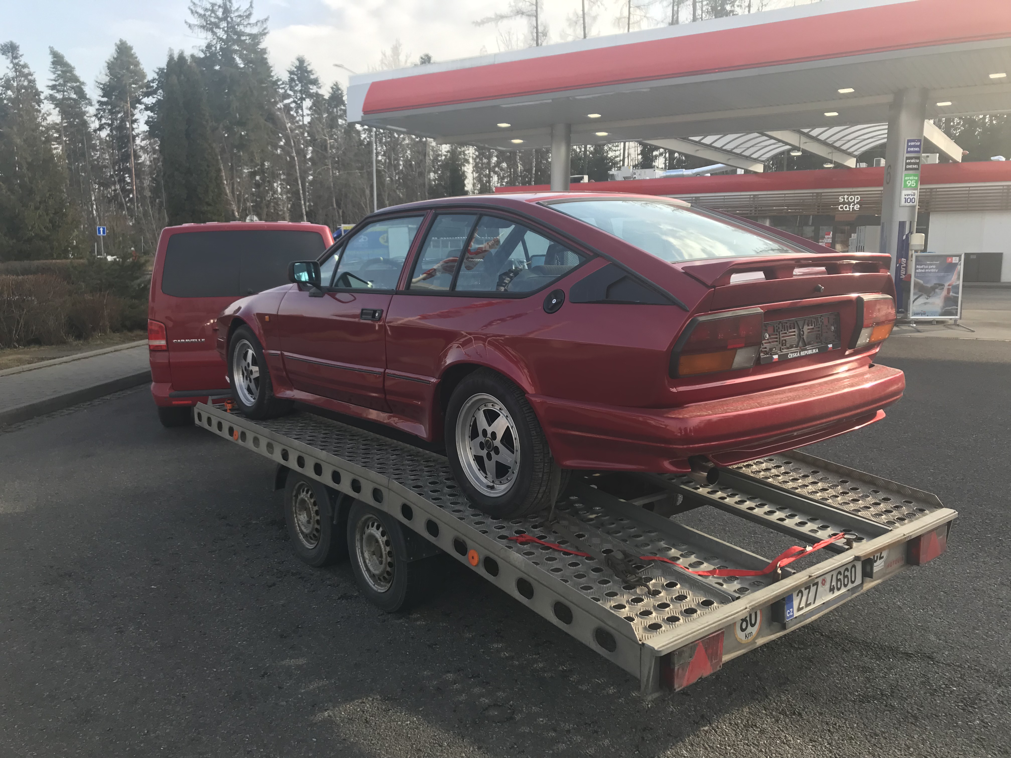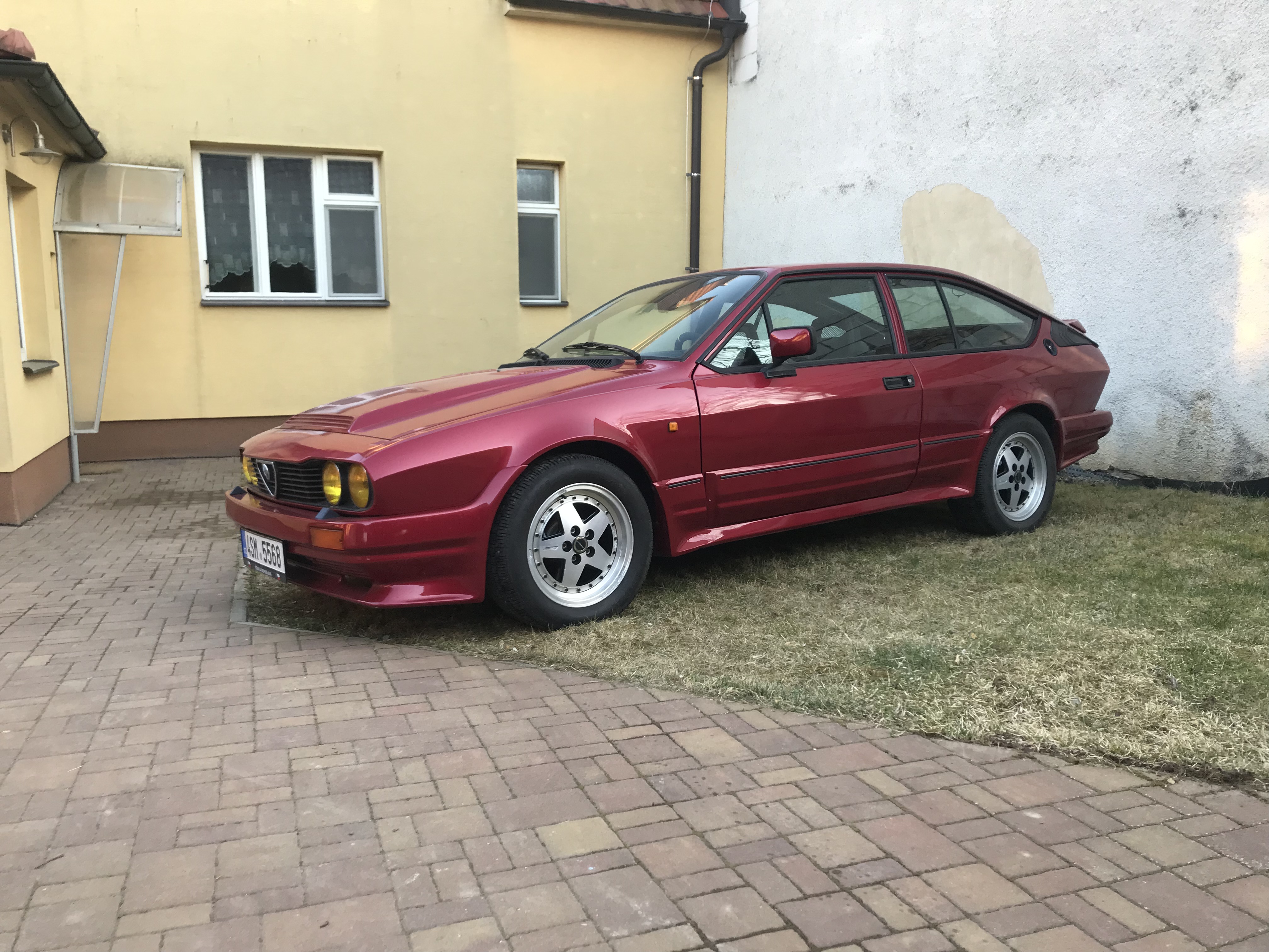 Jedná se o AR GTV6 r. 1985 v Zender packetu. Karoserie až na pár orezlin je v dobrém stavu, motor je 3,0 12V, který už byl instalován předchozím majitelem v Rakousku, podvozek Koni, kompletní nerezový systém Supersprint. K autu je druhá sada kol (17" Zender Milano), nový origo výfuk (komplet) zadní a přední světla. Co se bude řešit v budoucnu tak je oprava laku na kapotě (prasklý spoj Zender nádstavce)+ drobná rez na podvozku, výměna všech náplní (i když v motoru je olej jak nový), seřízení ruční brzdy a výměna momo volantu za původní dřevěný. Příští sezónu spojka.