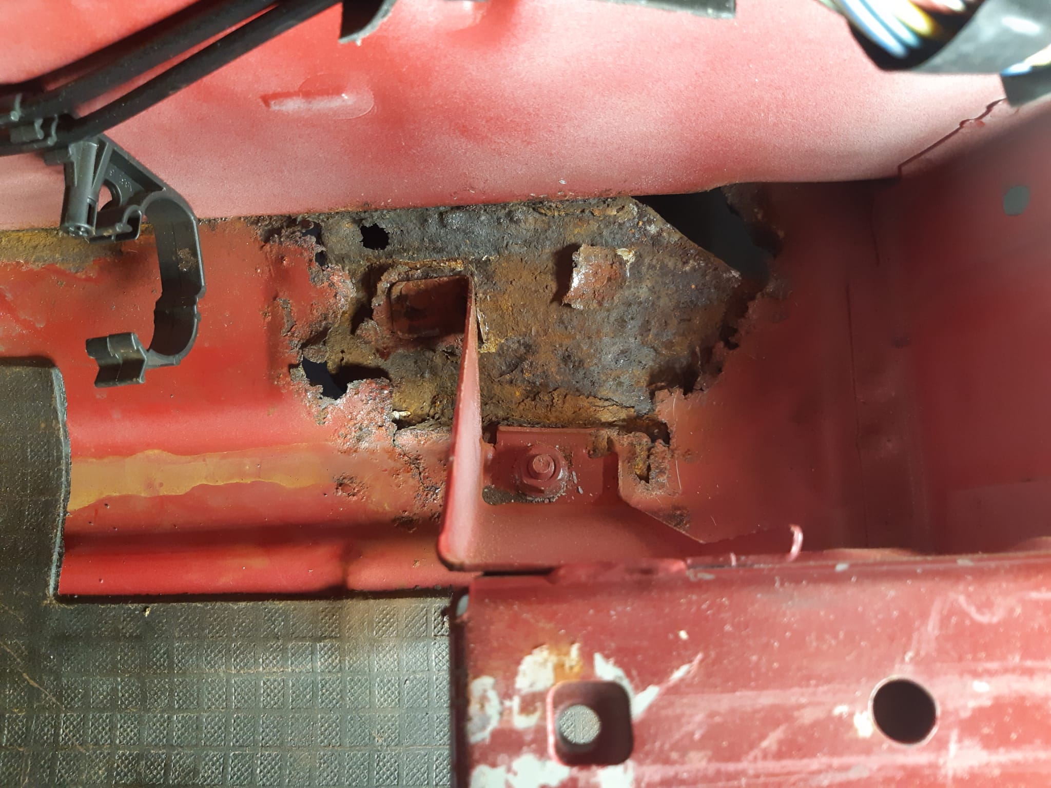 fronta do klempírny je dlouhá, tak jsme si trochu počkali, ale.. červená už je pod skalpelem a kromě těch očekávaných prahů a díře pod řidičem je auto čisté a základ je to dobrý. někdy začátkem léta budeme dělat pískování povrchovky v podbězích a něco málo na nosnících a komplet podlahu (kde se neudrží plastizol).