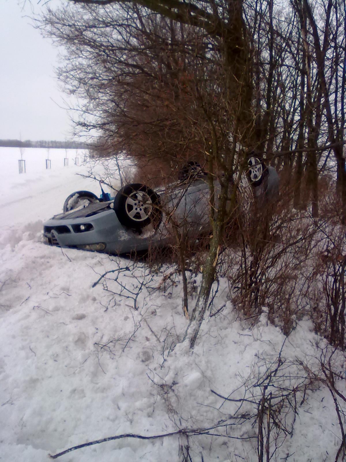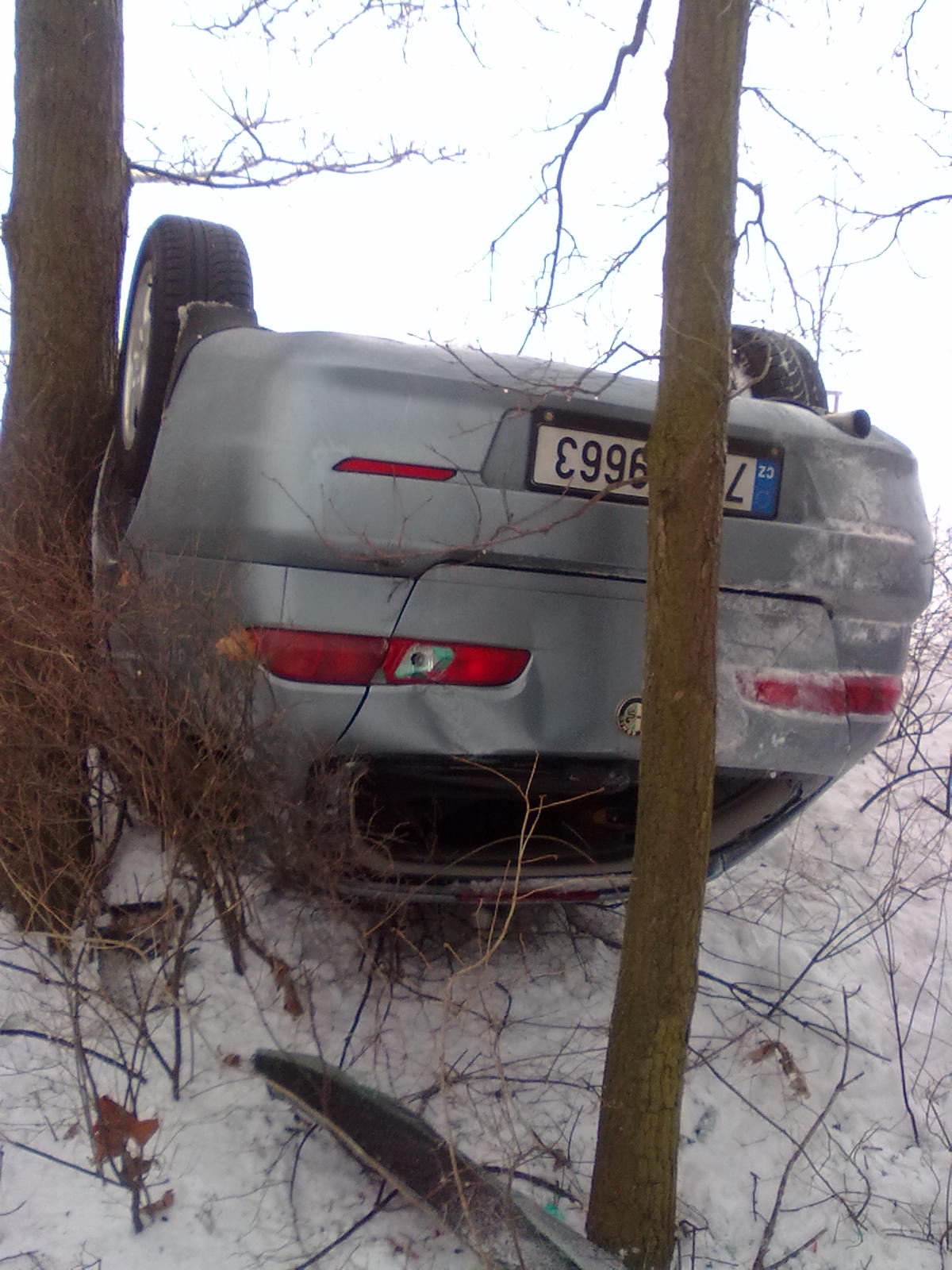 Zkontroluju si rychlost stále necelá 80ka. Na poslední chvíli si všimnu vyfoukaného sněnu do 3/4 silnice, nevím tak 30 - 40 cm vysoký jazyk. Ve chvíli kdy sem do něj narazil došlo k přetáčivému smyku zadní nápravy, takže spojka kontra, na druhou stranu na druhou stranu začal sem přibržďovat stále tam a zpět odhadovaná rychlost je v tuhle chvíli cca 40. Vypadá to že to ustojím ale bohužel. Pak sem chytil na pravé krajnici hlubokej sníh vytáhlo mě to do pangejtu a když už sem vyjížděl ven a auto skoro stálo, tak sem zadkem nabral keř přes kterej se to prostě zvrhlo jak krabice od bot. Navíc tak podivuhodně že byl zadek přehozenej až přes strom a byly sme otočený čumákem do protisměru.