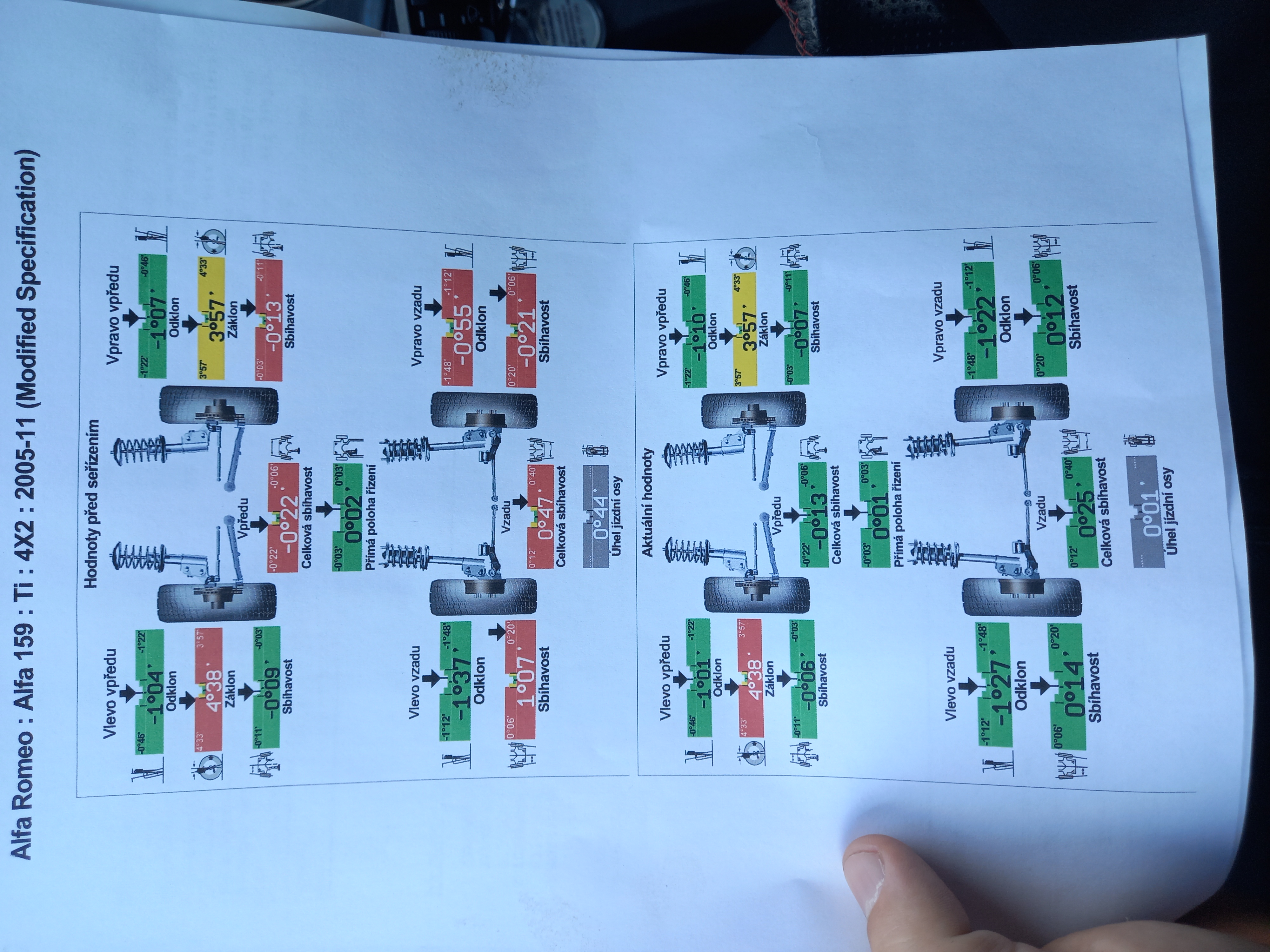 Zajel jsem na nejmodernější geometrii, co u nás je, ale tam zase neměli míry na verzi Ti, které se od standardní 159 celkem dost liší. Dodal jsem mu je ze servisky. Po nastavení jsem se zděsil. Nebyl snad jediný parametr, který by s údaji v servisce souhlasil, většinou se výrazně lišil. Technik mi vše nastavil podle předepsaných dat, hrabal se s tím snad hodinu. Jak píše Milan, tak velký klíč ještě nikdy nepotřeboval a jak píše Radim - s odklonem vepředu se prý nic dělat nedá, je to napevno z fabriky, ale to bylo naštěstí v normě.