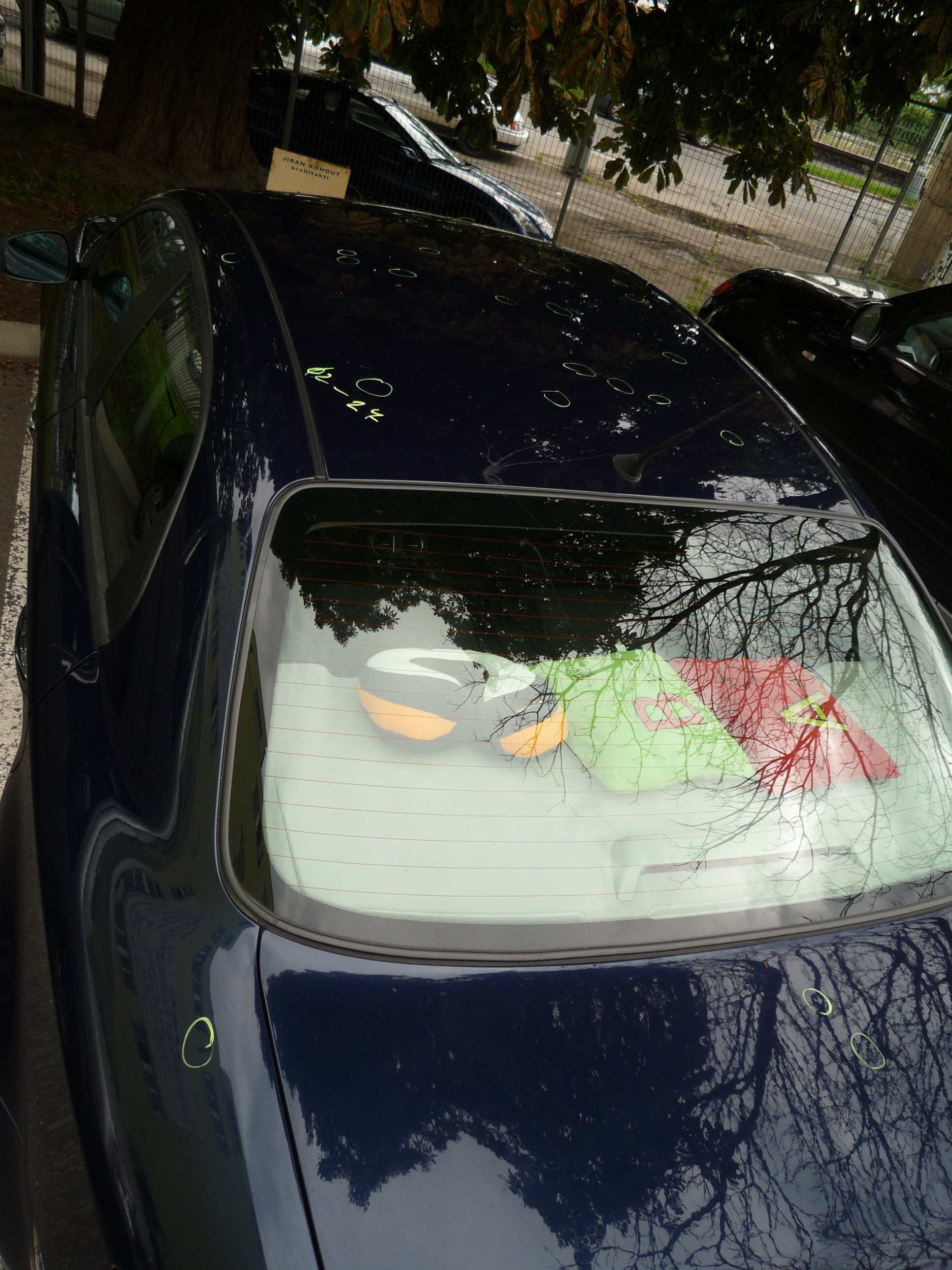 bo v sevisu, kam mě nadirigovali z pojišťovny budou mít na nás čas až nejdřív za 14 dní... Zkusim ten zdývající 1,5 tkm dojezdit až potom ale nevím nevím. Přikládám pár smutných obrázků s pojišťováckým zkrášlením. 27 děr ve střeše, 7 v kapotě, 2 ve víku od kufru, 2 LZ blatníku a díra v čelním skle - na tu jsem tedy čuměl v pondělí ráno jak zjara - myslel jsem, že tohle umí jen šutr na dálnici...
