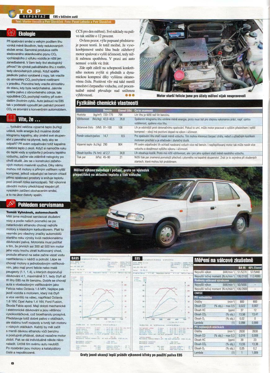 Ted jsem četl clanek že světa motorů kde to testovali na felicií kdy dali poměr 50:50 a měřili výkon kdy po téhle směsí naměřili výkon 57 kw tedy o 7 kw větší. S timto poměrem by neměl byť problém. U nas to taky začali prodávat cena je 22,8 kc. Jinak jinde jsem četl nárůst vykonu o 10-15 procent. Kvůli vysokému oktanovepmu číslu 109 a většímu ochazovani spalovaciho prostoru tak nevim. Jinak do neupravenyho auta by se asi víc jak 50 procent e 85 davat nemelo pak uz to nejede nestartuje a zere, ale zaae záleží na ridici jednotce jak si uráčí dobu vstriku. Zkusim dat pak půl nádrže do fiata a uvidíme.
