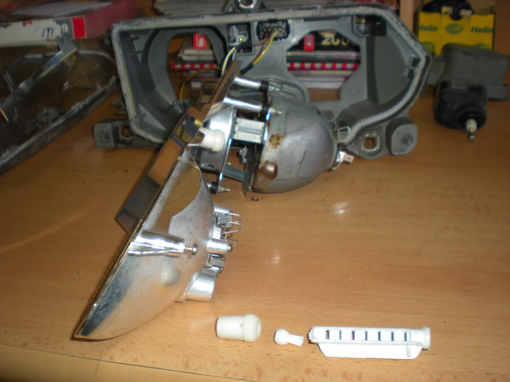 Láme se ten bílý plast u kulového čepu a důsledek je, že kromě neseříditelnosti světel jsou paraboly volné, takže si to svítí kam chce. Záleží, jak velký hrb se přejede. Zkusím to nějak vymyslet, vyrobit a nahradit. Případné nápady a návrhy rád uvítám.
