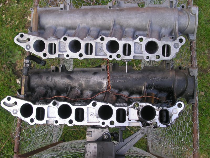 Použité sání jsem sehnal levně, protože vířivé klapky byli KO. Klapky jsem odšrouboval a osky zalepil zpět hliníkovým epoxidem. Nové těsnění mezi sání a hlavu se dá na netu koupit pod 500.