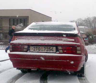 Tak jsem dneska neodolal a když jsem viděl tu vrstvu sněhu na silnici, vytáhl 75-ku. V poledním žáru bylu venku -14 a zatímco většina lidí trávila vydatný nedělní oběd já se dobývám do 75-ky. Nastartovala napoprvé, ale nejde otočit volantem. Co to ? Aha přimrzlá kola k zemi. Nejdou zavřít dveře u spolujezdce, pomohl horkovzduška a zámek povolil. Už můžu konečně vyrazit. Co Vám budu říkat, zadokolka se samosvorem, prostě paráda. Naprosto nezáludný jízdní vlastnosti, každá zatáčka bokem, zatáčí se plynem, brzdí očima. Vybíral jsem si silnice se značkou že se v zimě neudržují, abych auto moc nezasolil. Kolem Seče sypou jenom drtí a to byl ideální povrch pak uježděný sníh. Nejhorší byla rozsolená břečka, to se Alfě nelíbilo, asi kvůli soli, ale opravdu to krutě klouzalo. Každýmu kdo má doma transaxle kašlete na to, že se to zasolí a vyražte. To se jinde než na sněhu nedá zažít. Nevíte o co přicházíte. Je fakt, že jsem měl všechy nový zimní gumy, ale zase Sava není žádná top značka (ono nic moc rozumnýho v rozměru 195/60 R14 nešlo sehnat). Jestli je to off topic Kubas bude hodnej a přesune to.