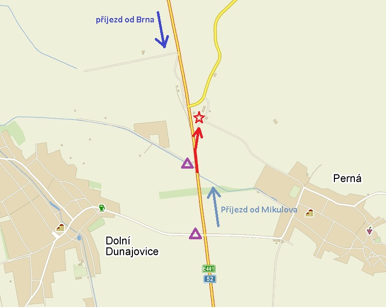 Na místo srazu - parkoviště u Spálené hospody - je možný vjezd pouze ze směru od Mikulova. To znamená, že Ti, kteří přijedou od Brna budou muset přejet a otočit se buď na odbočce na TRANSGAS nebo na křižovatce Dolní Dunajovice / Perná. Viz trojúhelníčky na přiložené mapce. Ta druhá možnost bude asi lepší.