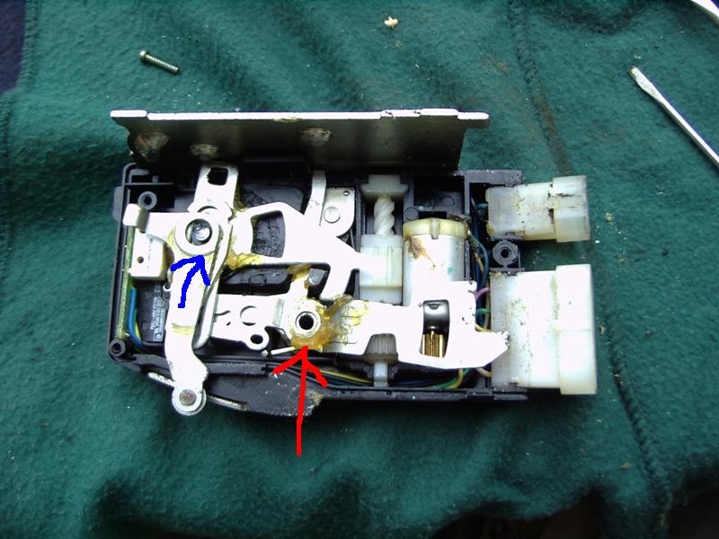 ..tak jsem konečně vyřešil problém s občasným odemykáním a zamykáním mé Alfiny. Odešel motůrek u spolujezdcových dveří. Není to až tak těžké, jen když se to dělá poprvé, jako u všeho;-) Dlouho jsem nevěděl čím to je, rozebíral jsem středovej panel (viz. toto téma), hledal jednotku centrálu atd. Nakonec jsem rozebral dveře, vyjmul celej zámek dveří a zjistil, že ten motůrek se vypálil a dělal neplechu. Vopruz největší je, že se musí odvrtat dva pevný spoje(nevim jak se tomu řiká, něco jako nejty, prostě hliníková tyčinka na obou stranách rozklepaná na obr. modrá a červená šipka), odšroubovat tři šroubky a neulomit asi čtyři pacičky;-) Jinak je to v poho. Dobrý a celkem kvěcný je, že u toho jednoho odvrtaného nejtku je závit(červená šipka), takže se tam potom dá dát normálně desítka šroub který to celý krásně zpevní a dá se to potom kdykoliv zase rozebrat. Drátky na motůrku se přepájí a taky sranda je přehodit to ozubené kolečko na něm, chce to trochu šikovnosti a je to. Použil jsem motůrek z jiného centrálu a vše opět funguje a já jsem šťastnej, že ji mužu nechat chvíli bez dozoru