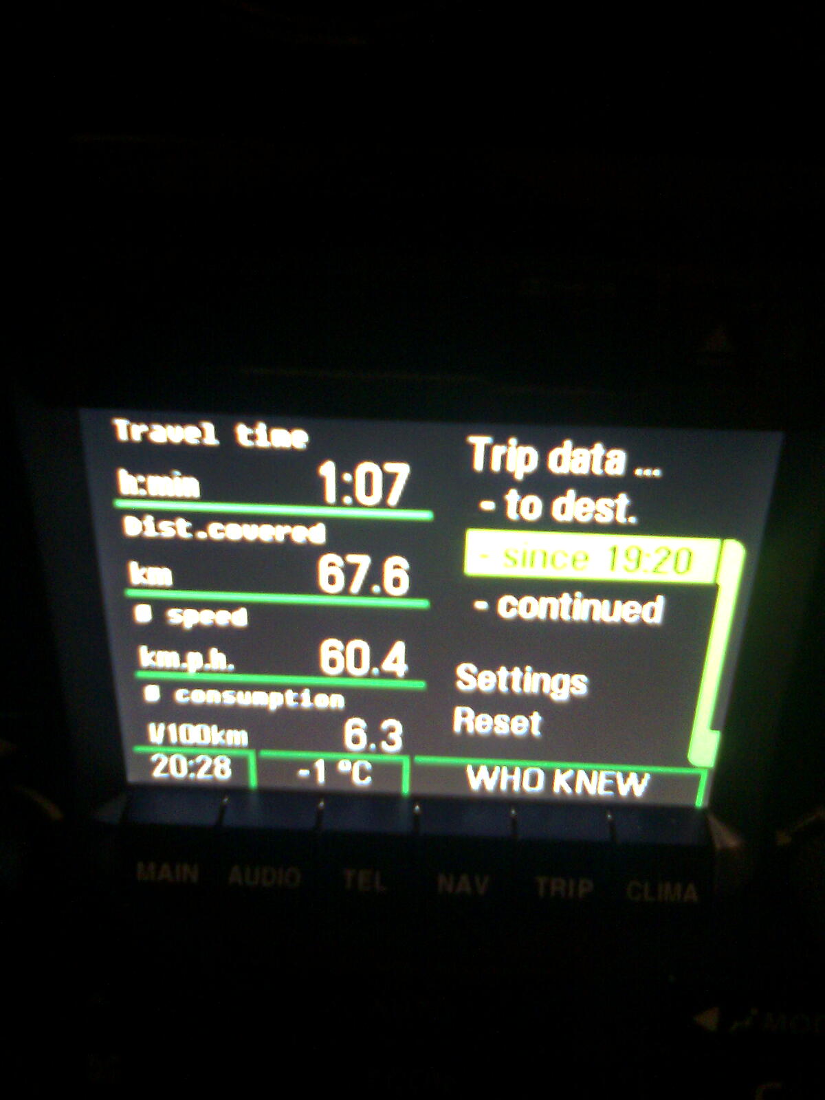 Pro ty kteří by to nemohli rozluštit je to 3,9l během 60km s průměrnou rychlostí okolo 70km/h