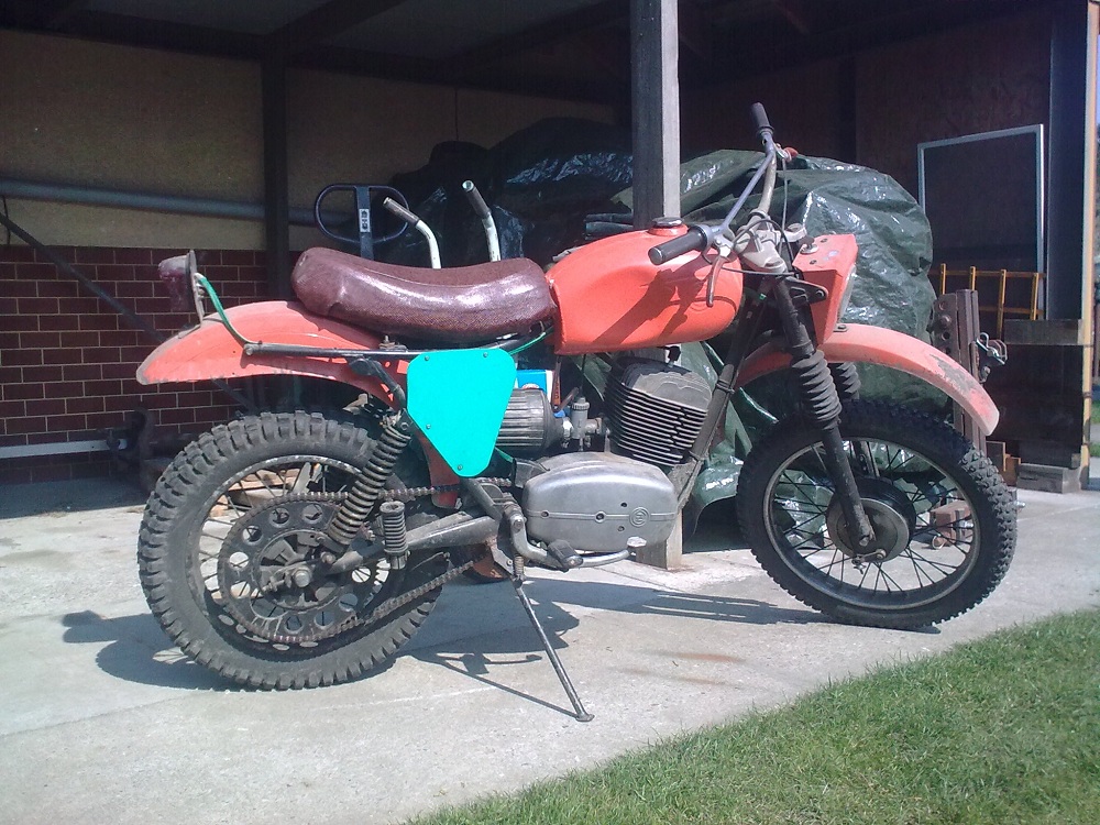 Takže toto sice není ta 175ka kross,kterou jsem sliboval, ale otcova též mírně upravená a hlavně je na značkách. Předni vidlice je z 350ky, zadni pružiny nakloněné dopředu a v zadu je dané menší kolo. Na takovou tu víkendovou projížďku do dostačuje.