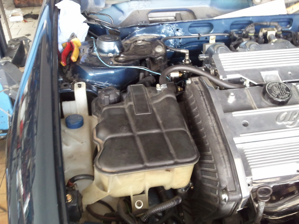 Dnes jsem byl u auta vyzkouset a namontovat par drobnosti ktere jeste schazely. Dale se strikalo vyfukove potrubi do cerne matne takze Alficka byla po nastartovani trchu hlucnejsi. Po kontrole na zvedaku byl ale bohuzel zjisten mensi problem - unika prevodovy olej (prevodovka je nove pretesnena) - snad to nebude nic vazneho a vse se da behem zitrka do poradku. Jinak motorovy prostor je komplet nastrojen - zbyva jeste "ucesat" kabely ke svickam, nasadit kryt svicek s napisem te prave znacky a je hotovo