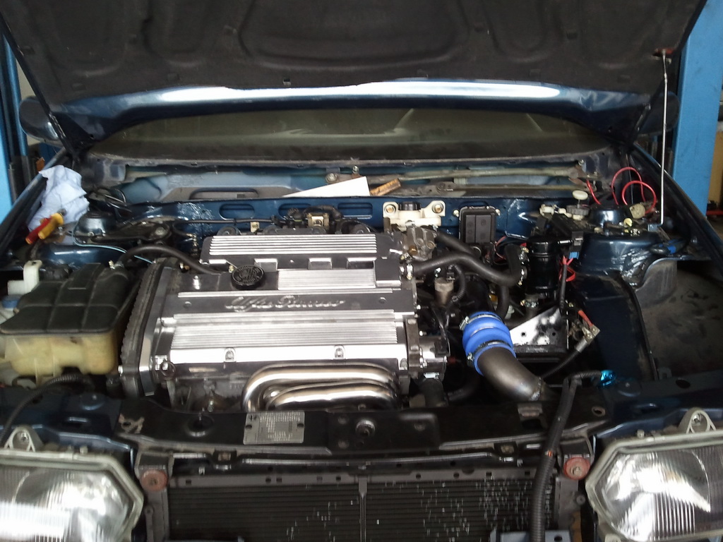 Takhle zni Alfa bez vyfuku - musel se odmontovat protoze se dodatecne lakoval do cerna matne. Zahrivali jsme motor a jeste jednou kontrolovali zda sepnou sahary, koukali jsme zda se neobjevi nejaka netesnost atd. Bohuzel ta se objevila prave u prevodovky jak jsem zminoval.