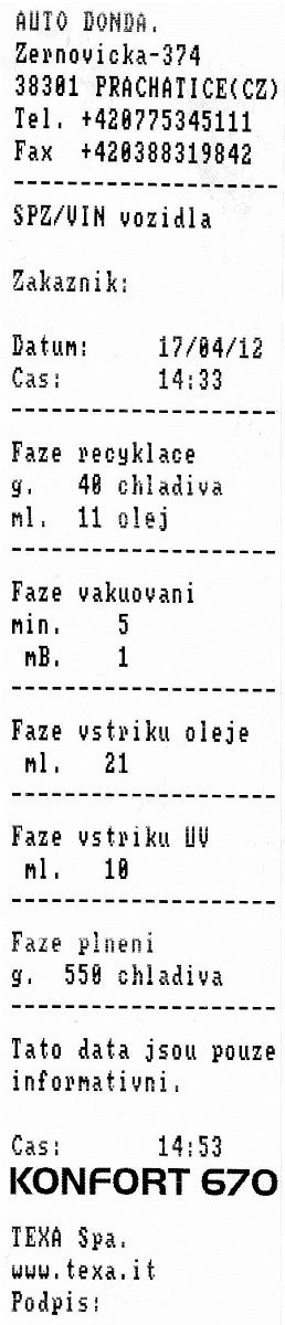 Dostal jsem k tomu tento výpis. Ta mašina rovnou kontrolovala únik, prý tam žádný nenašla, ale že není schopná odhalit drobnou dirku. Ale dal mi tam rovnou nějakou příměs, která by při úniku byla vidět. Zároveň na sebe musím ale přiznat, že jsem ke klimě byl trochu lajdák, klimatizaci jsem nyní čistil a doplňoval poprvé za 2,5 roku, co auto mám. Tak doufám, že to byl přirozený únik.