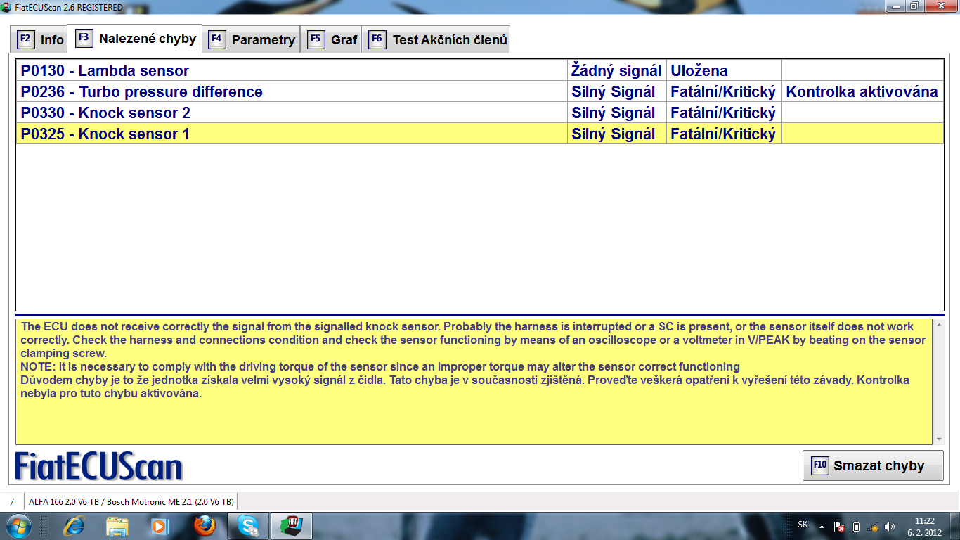 twiister: chyba č.1: buď odišla lambda alebo to má súvis s chybami č.3 a 4, čo sú snímače klepania. Ak hlásia chybu, tak RJ motora "neriadi vstrekovanie paliva" na základe hodnôt z lambdy atd. ale z default hodnôt. (aj keď sa mi nezdá že by to potom dávalo chybu lamdy) Ak ti tú chybu stále vyhadzuje môžeš mať napr. zvýšenú spotrebu. Skúš pozrieť kontakty na tých snímačoch.