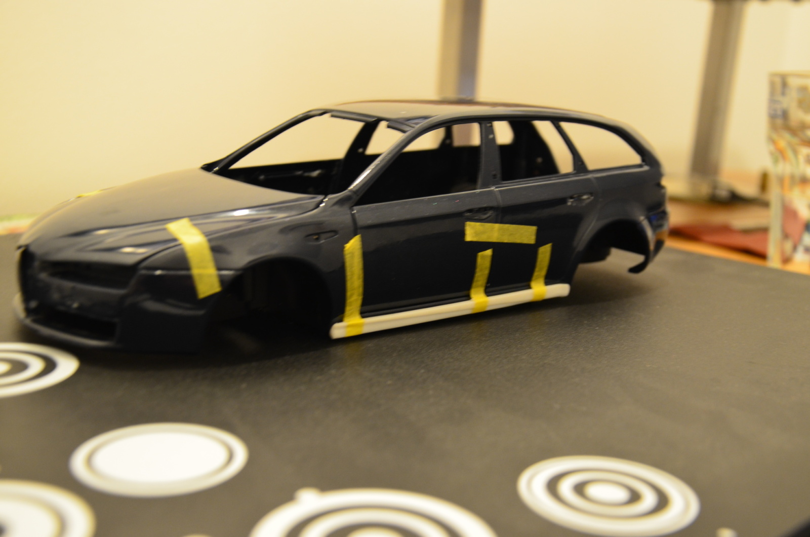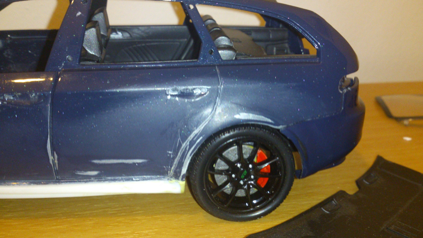 Tak práce na malé Alíně zase trošku poposkočili...byla snížena, dostala nová kola 19" jako ta skutečná dodělány spodní TI prahy, přilepeny a vytmeleny, zahajeno barevné vylepšování motoru a interiéru...