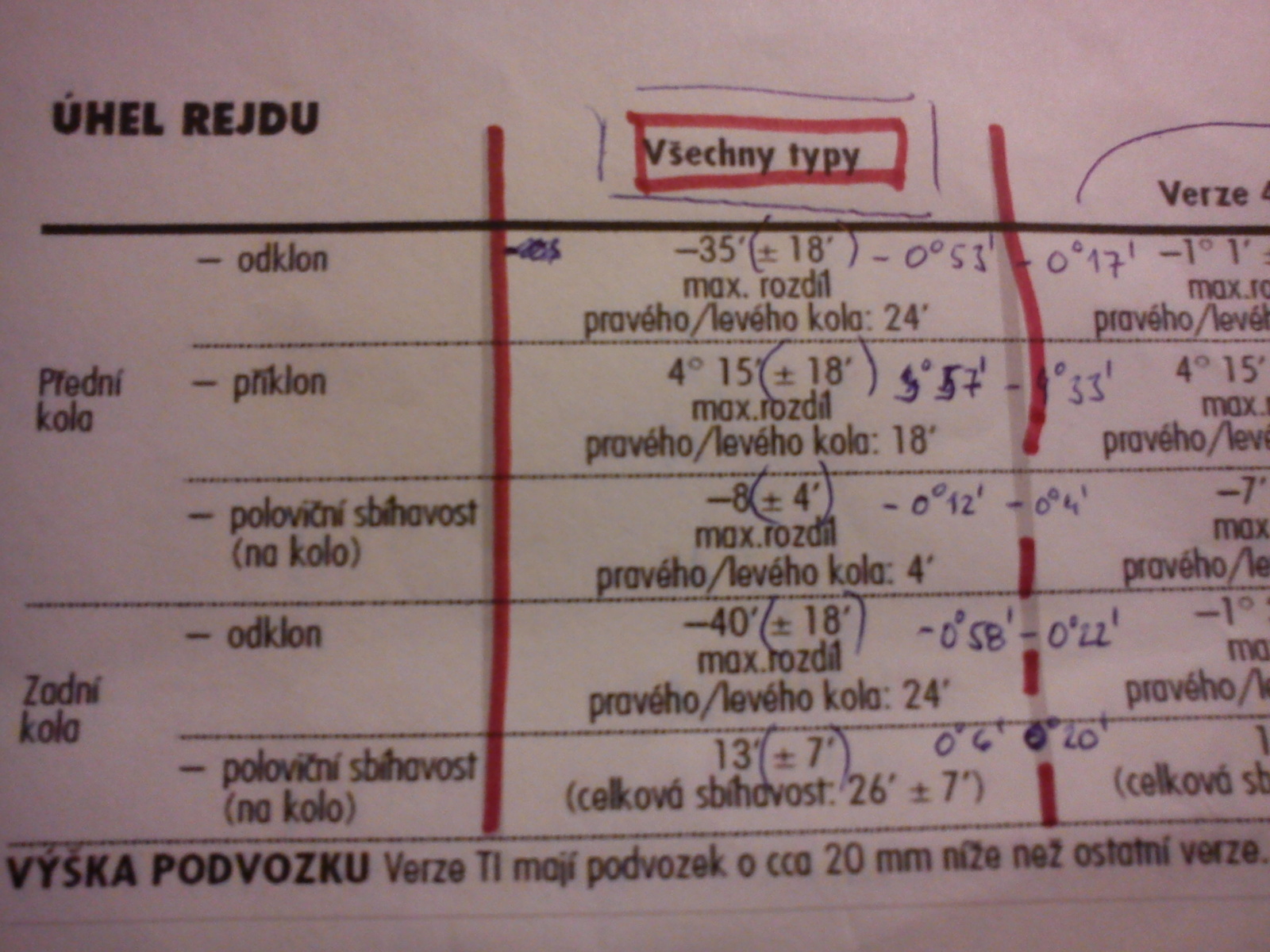 1. co nám udává manuál: 2. co zde vystavil Tanquero (údajně dobré hodnoty) 3. jak mi to nastavili v červenci 2011 4. a jak to mám teď - tj. březen 2012 Takže jestli se na to dívám správně, tak č.1 a č.4 se naprosto shodují (porovnávám právě tyto dvě, protože všechny hodnoty jsou ve stupních a minutách) a č.2 a č.3 se také zhodují (tam jsou pro změnu některé v mm)! A tím pádem se ve finále shodují všechny čtyři! Zatím to tedy spíš nahrává verzi, že předepsané nastavení je opravdu jedno a totéž - tudíž sjíždění bude "normální" - resp. se na tom dost podstatně podepisuje styl jízdy..