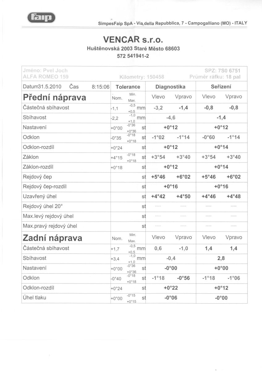 Jo, musím říct, že mě s těma různejma hodnotama dost s... Že si prostě zrovna takovou věc, jako je geometrie neohlídají. Přitom právě jízdní vlastnosti jsou jednou z mnoha věcí, ve kterých je Alfa nedostižná. Kdybych měl fakt jistotu, že je pravda, co mi před půlrokem řekl technik z Imofy - a sice, že hodnoty jsou všude v pořádku a sjíždění vnitřků na předcích je prostě daň za jízdní vlastnosti auta, tak to neřeším a klidně koupím troje gumy za sezónu - ona si to rozhodně zaslouží!