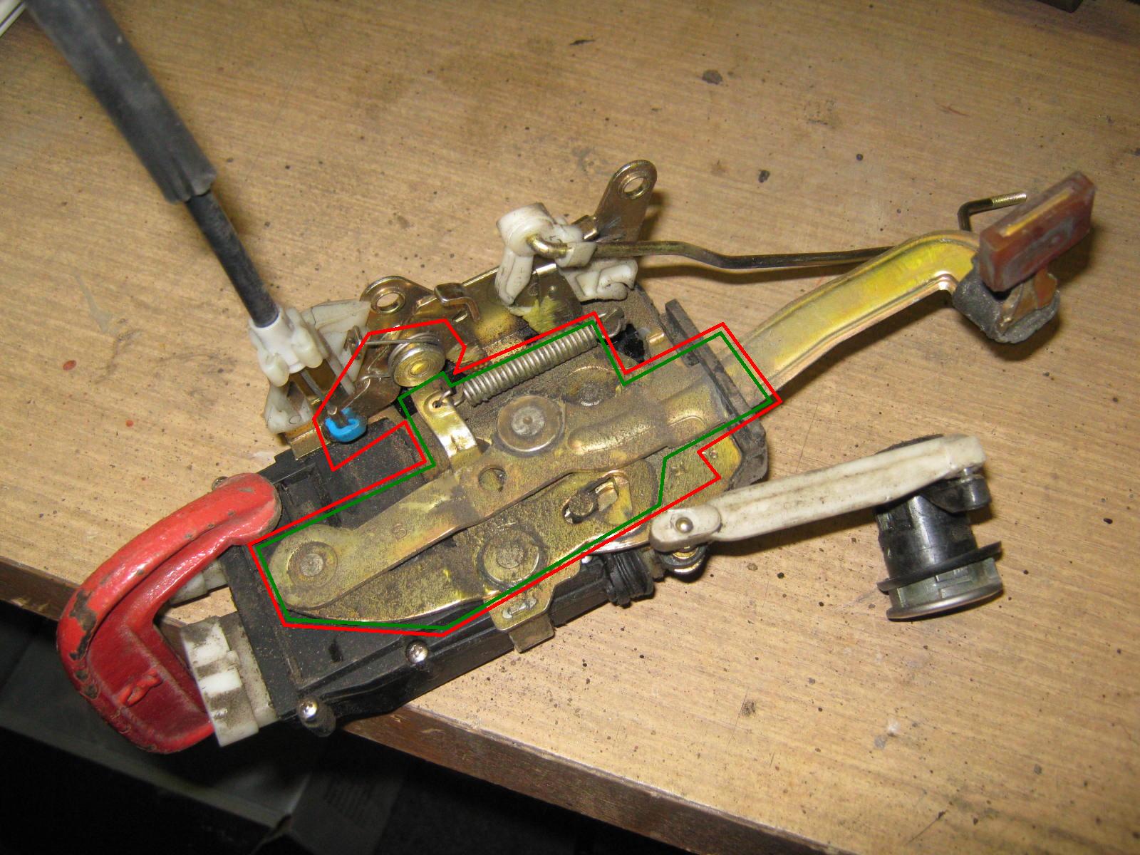 Pokud taháš za vnitřní kliku (lanko), hýbe se celý komplet - červený rámeček. A to včetně velké páky pro vnější kliku.