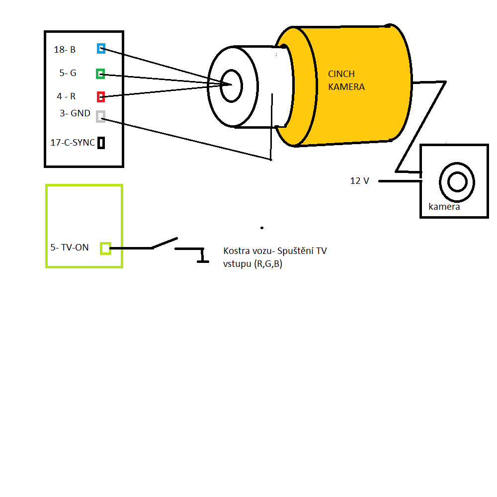 A zde ze jak napojit kameru místo SCARTU. Kamera by měla být na 12V a měla by mít jeden CINCH vývod :