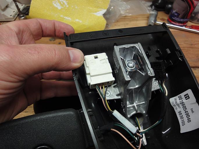 Napojení elektriky. Na konektoru v zrcátku je více drátů, přímo do samozatmavovacího zrcátka vedou naštěstí jen 3 dráty: černý, žlutý, zelený. Po sérii pokusů: černý= -, zelený +, žlutý je na připojení + od zpátečky (zrcátko se odtmavý při zařazení zpátečky, pokud je zatmavené). Stačí napojit černý a zelený a bude Vám fungovat stmívání a to v módu automat indikované zelenou ledkou. Spínač na spodu zrcátka bude fungovat jako ON/OFF automatického módu.
