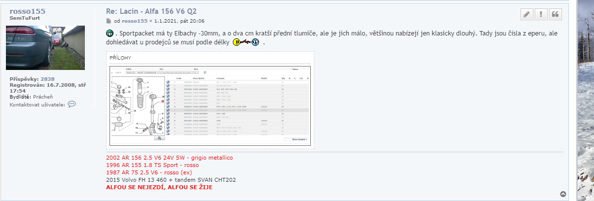 Dobrý večer, musím vyměnit tlumiče a pružiny na své AR 156 2.4 JTD 20v. Chtěl bych ty co se dávali originálně na TI / GTA (tzv. Sport Packet), ale bohužel je nejsem schopný dle ePERu nikde najít. Vím, že mají být snížené o 25mm. Bilstein / Eibach jsem našel jen -30mm a to si myslím, že je moc. Neví někdo číslo či odkaz na tlumiče pro GTA / TI / Sport Packet ? Děkuji mnohokrát. Pěkný večer.