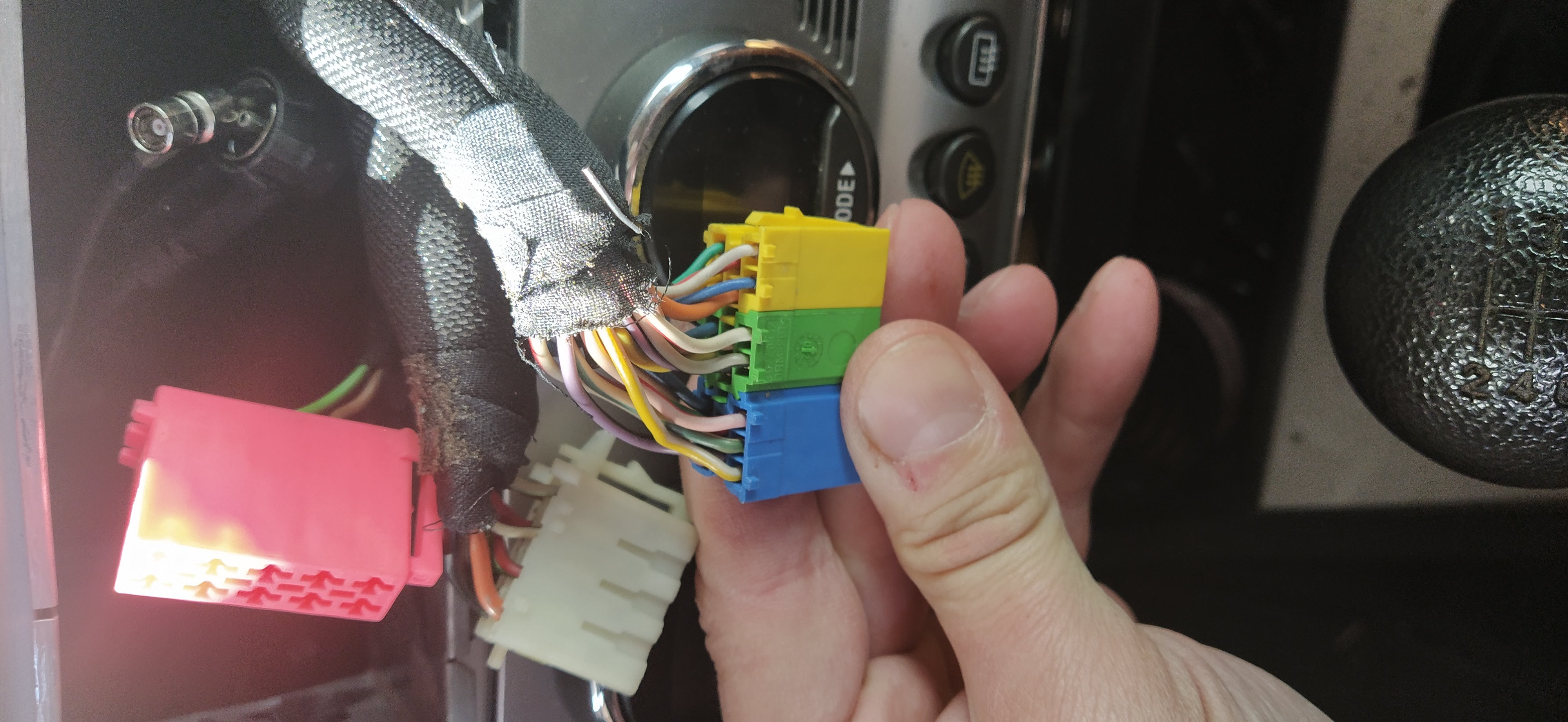 Dva obrazky, jak to u me vypada, leva vetev, prava vetev, ze kterych vylezou dve velky ISA, ale co me zarazi - je tam jeste ten cervenej/ruzovej velkej konektor (na schematu nekde jinde ve foru oznacenej jako D, svislej vedle ostatnich ISO a miniISO, v nem jsou dva dratky, a tento tam nyni zustane nevyuzit, tzn. asi to nekam patri. Taky me trochu zarazi, ze z Alficky leze ISO A plny kabelu (vsech 8 vodicu), ale redukce Pioneeru jich pouziva jen pet ...