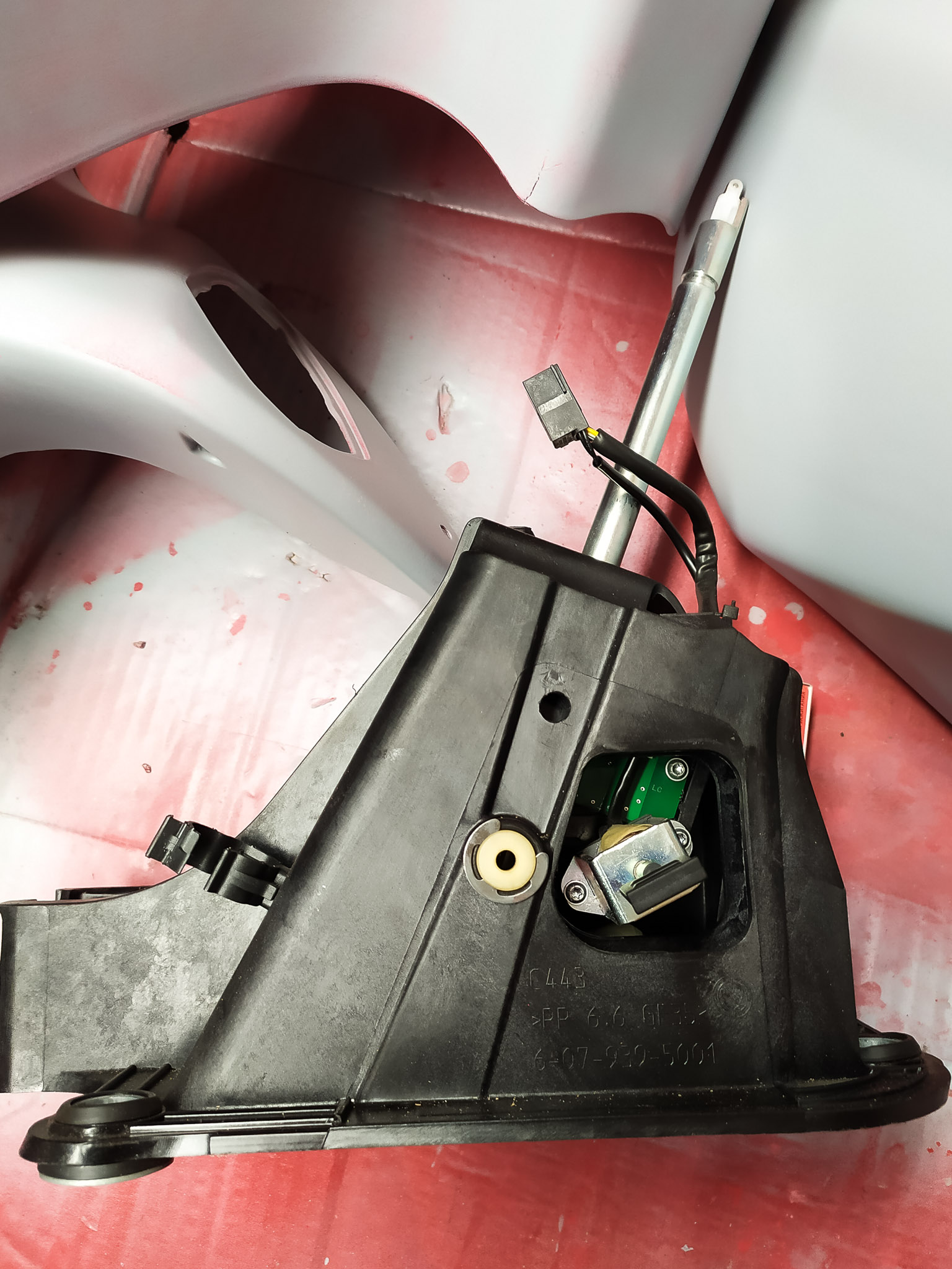 Co dělá tlačítko na páce? Na první fotce je úplně nahoře na celém mechanismu voliče vidět bílý plast, který vede z kovové trubky. Když stiskneš tlačítko na páce, bílý plast zatlačíš dolů a tím odjistíš i čep dole v mechanismu voliče.