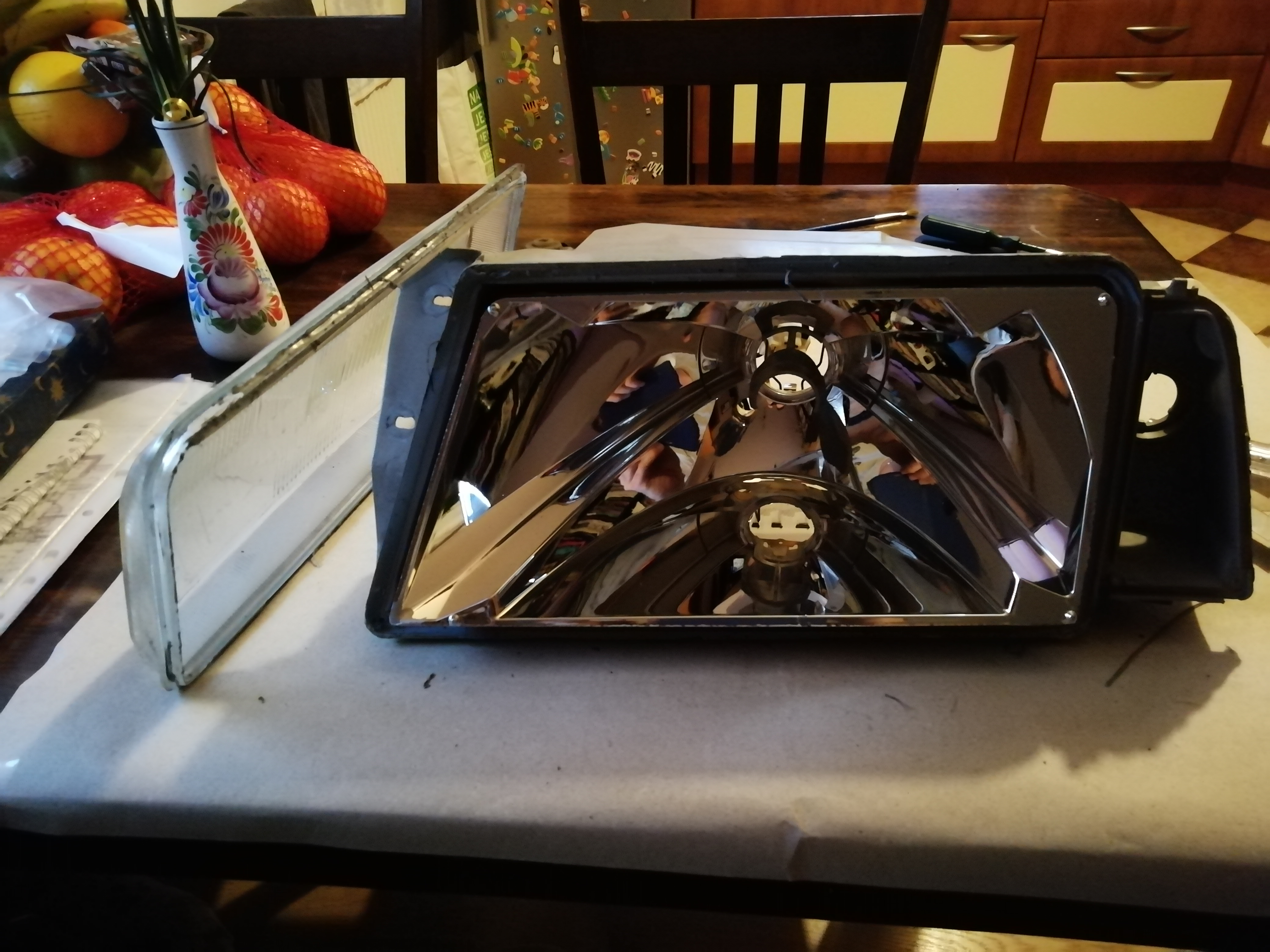 Včera jsem ještě demontoval světla, rozebral a zevnitř vyčistil skla. Byly úplně mléčný a vypadalo to blbě. Příjemné překvapení bylo, že pokovení barabol je úplně v pořádku, takže zítra je zpátky slepím a hotovo. Štvalo mě to několik let a nakonec práce na hodinu 😁