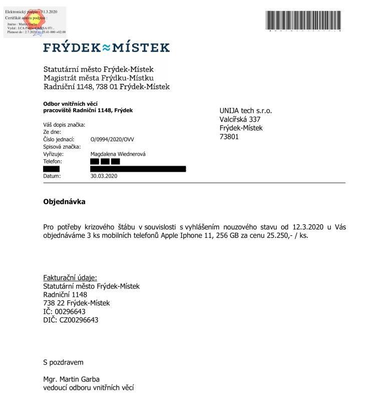Frýdek-Místek v souvislosti s koronavirem není zmiňován poprvé. Deník Echo24 totiž již v sobotu informoval o tom, že si několik členů místní bezpečnostní rady a krizového štábu pro své potřeby objednalo několik kusů posledního modelu telefonu Apple iPhone a další chytré telefony za desítky tisíc korun. Objednávky si ovšem všimli lidé na sociálních sítích a ukázalo se, že proběhla bez vědomí vedení města. Mobily se tak po kritice vrátí prodejci.