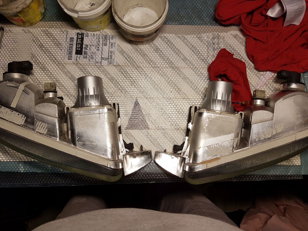 Takhle vypadaly ty puvodni, klasicky vypalena parabola: Odstranil jsem streva a nechal jen ty ramy, do kterych jsem osadil univerzalni mlhovky, ktere do tech otvoru sedly na chlup presne (jen jsem jim musel trochu pomoct bruskou). Vyhoda je, ze zustala zachovana mechanika naklapeni: A takhle ted sviti. Ty odrazy nahore jsou nejspis z te obnovene chromove vrstvy, co jsem daval delat naposled se svetlomety: