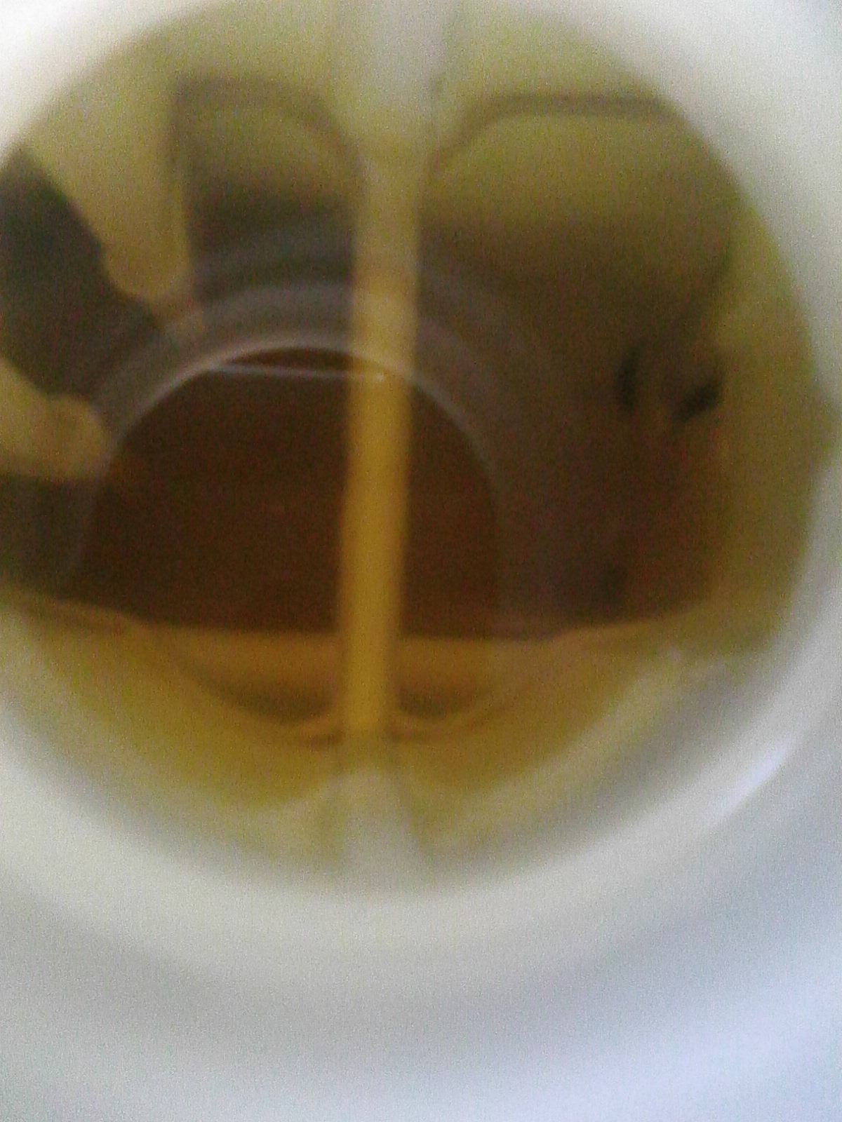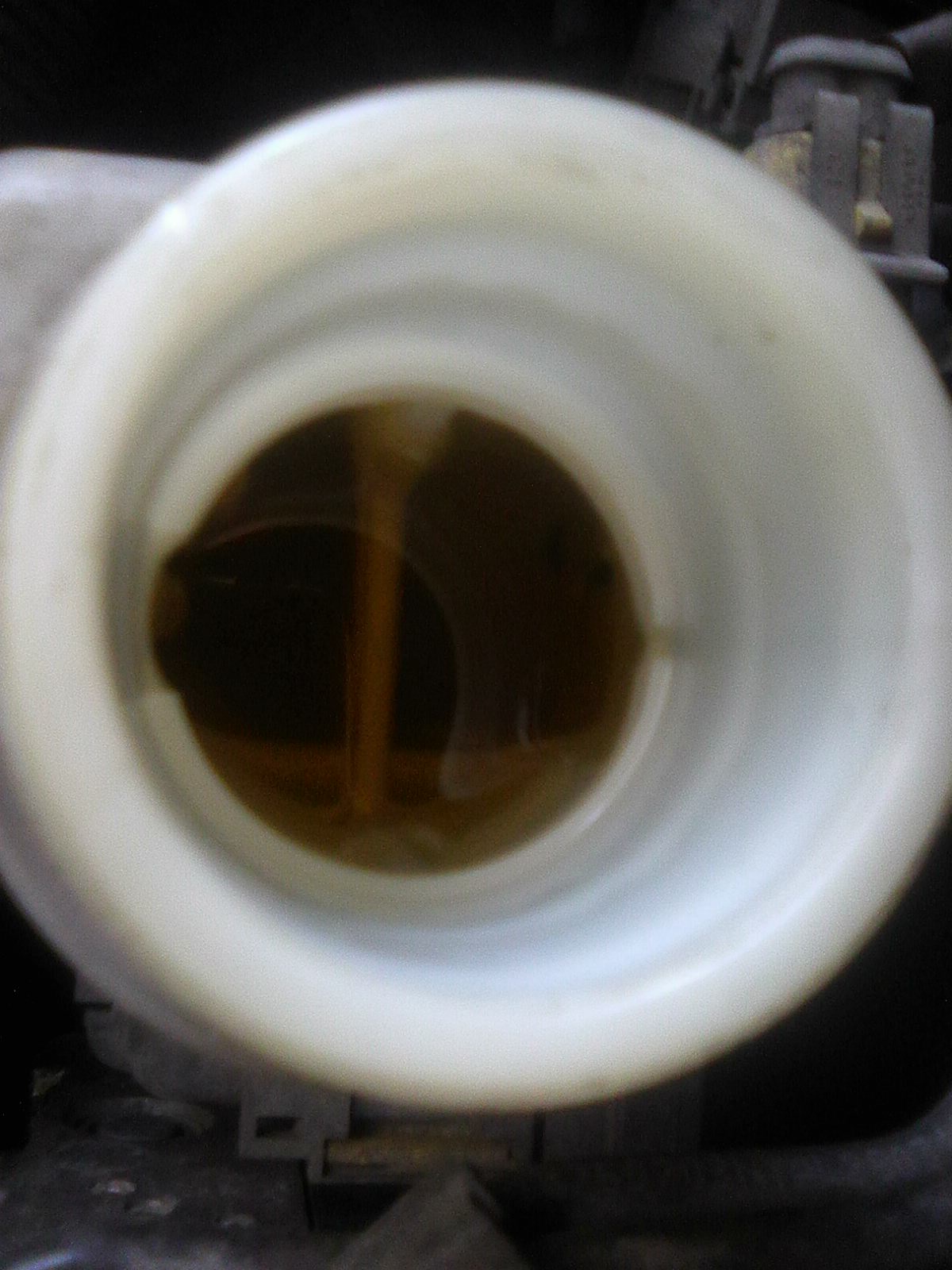 Druhý den bylo krásně,tak jsem šel studovat mou "černou" kapalinu.Když jsem se koukl zhora dovnitř,tak moc tam toho vidět nebylo.Jakmile bylo světla dost - krásná čistá kapalina.Tak si říkám,to budou třeba úsady na členitém dně nádobky-chtěl jsem to jakoby očistit,ale nešlo to.Tak zbývají dvě možnosti.Na další STK pořídit novou nádobku a nebo to nechat udělat někým jiným!!!!